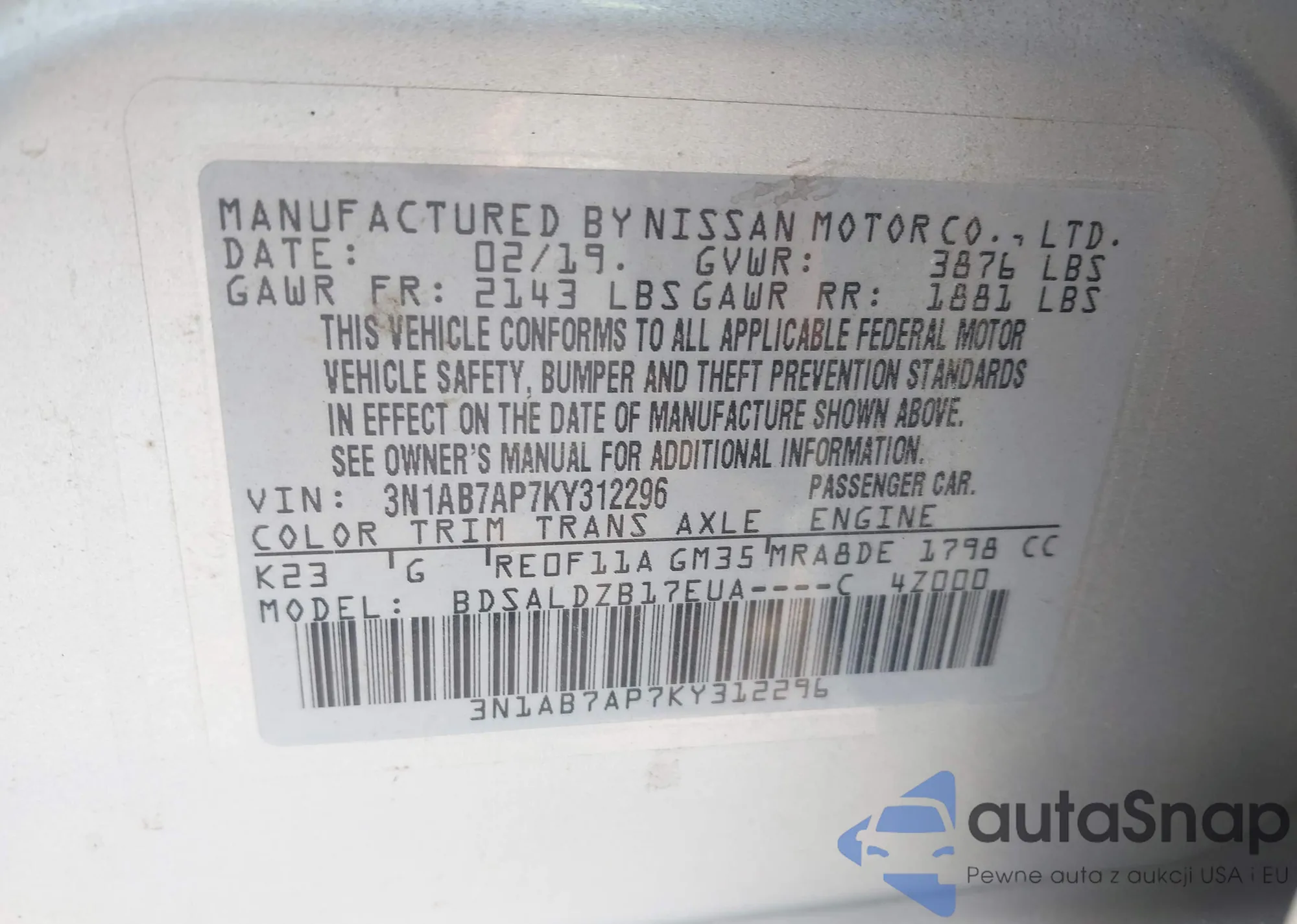 • VIN 3N1AB7AP7KY312296