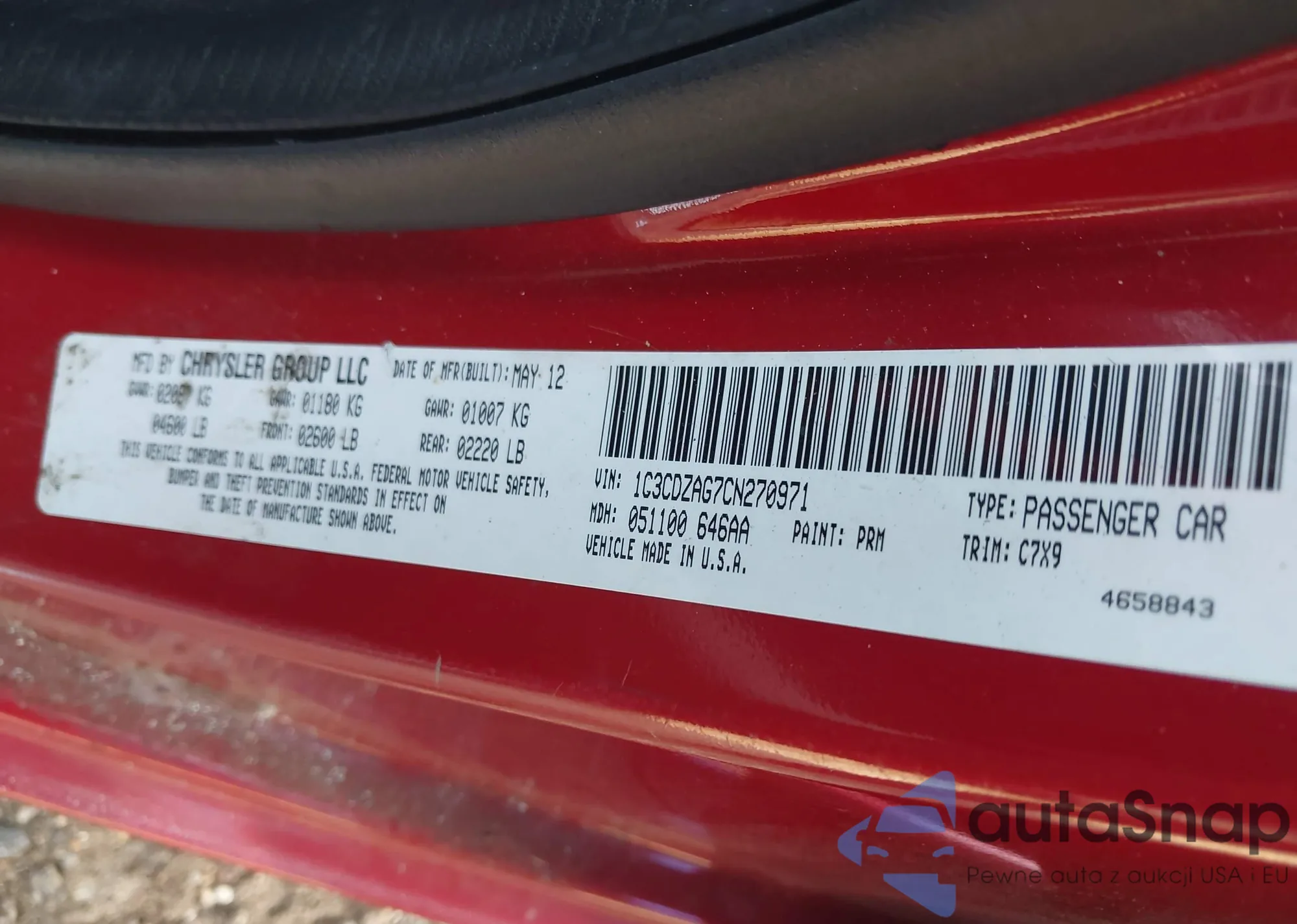 LOT: 42807250 VIN: 1C3CDZAG7CN270971
