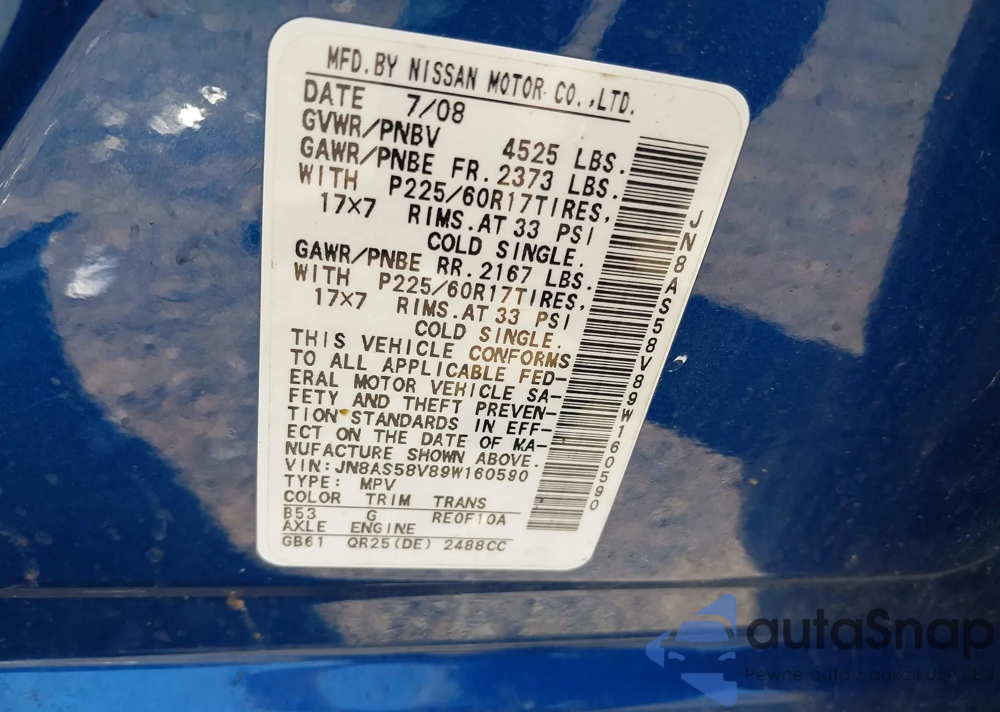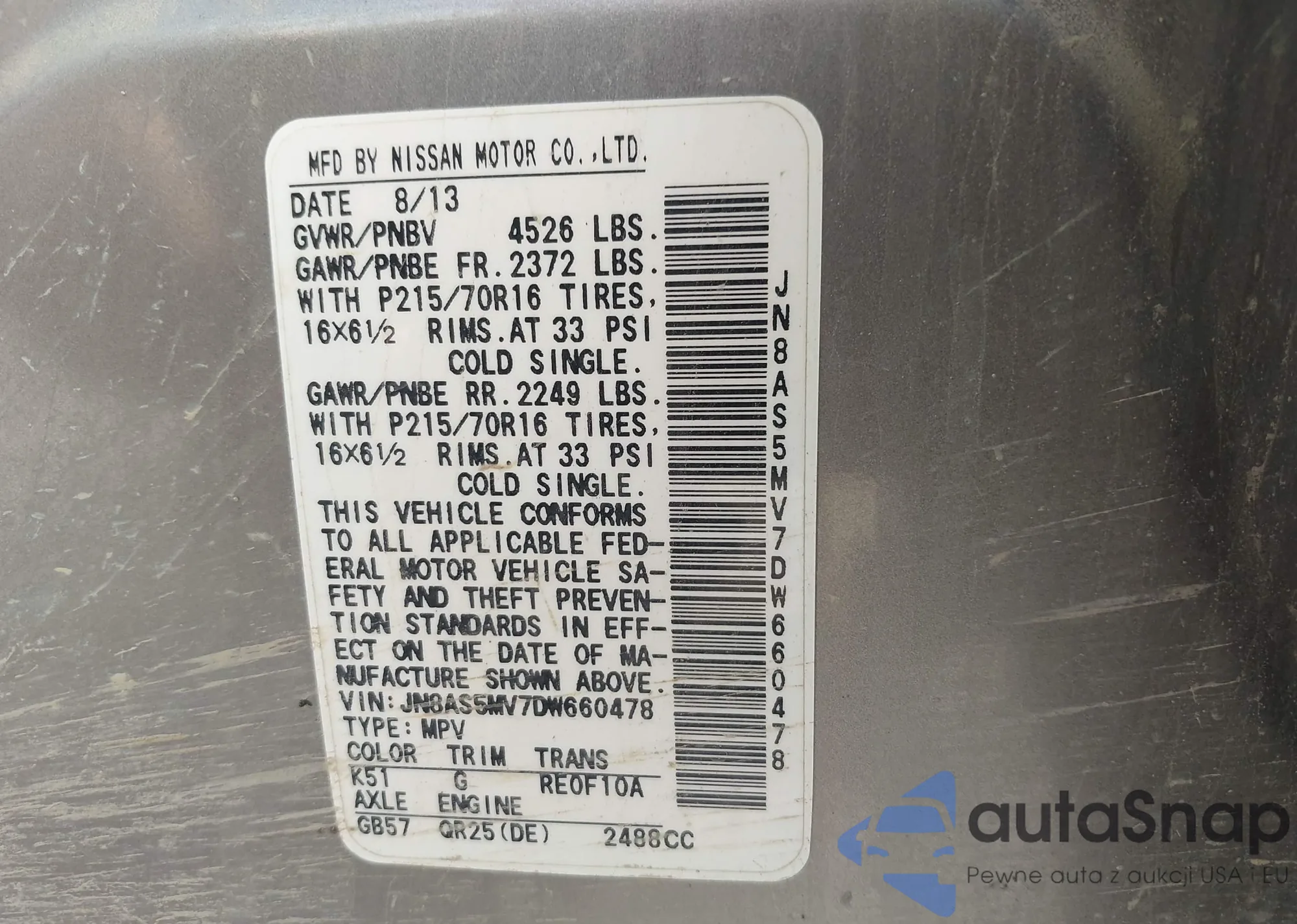 • VIN JN8AS5MV7DW660478