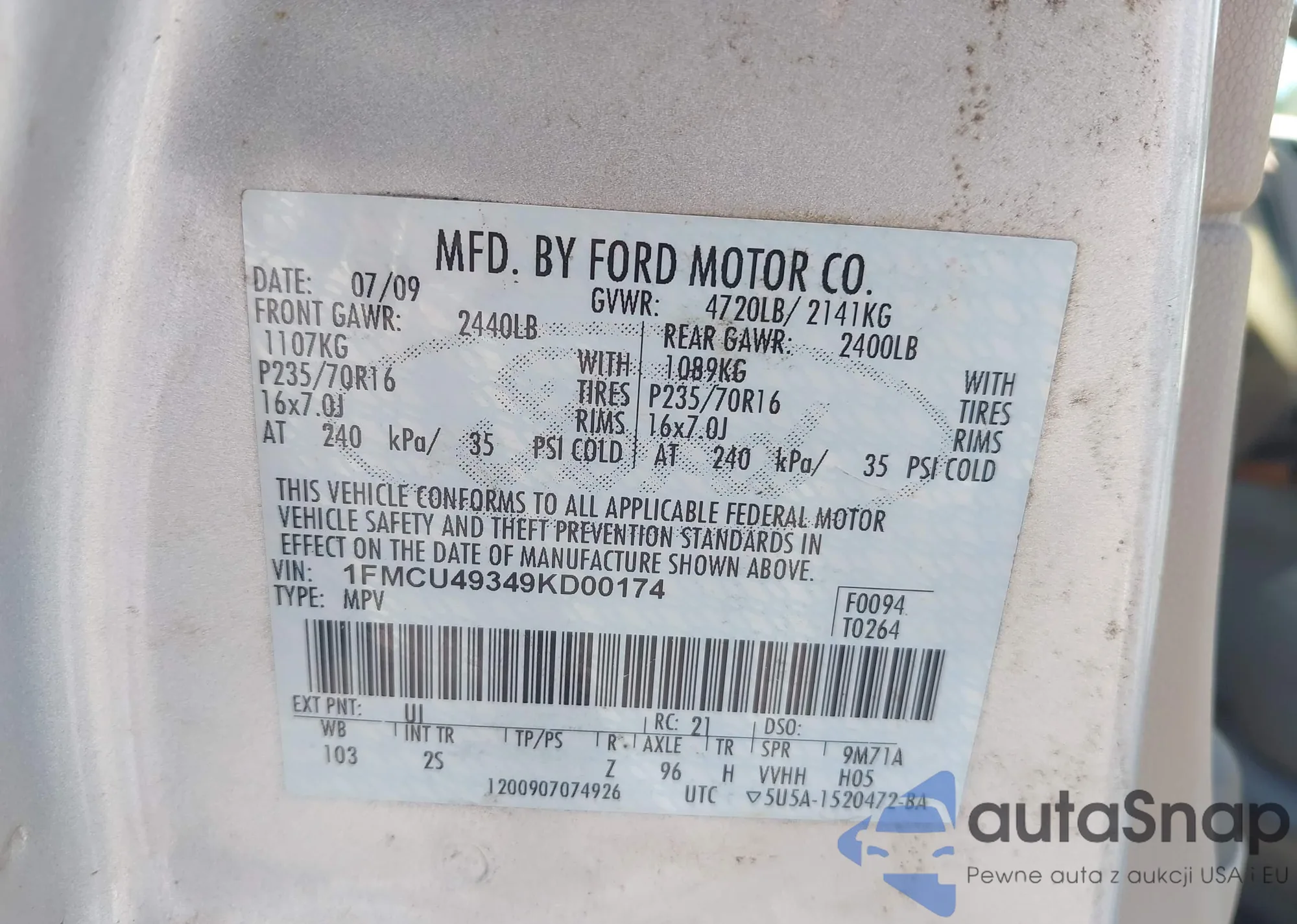 LOT: 43007396 VIN: 1FMCU49349KD00174