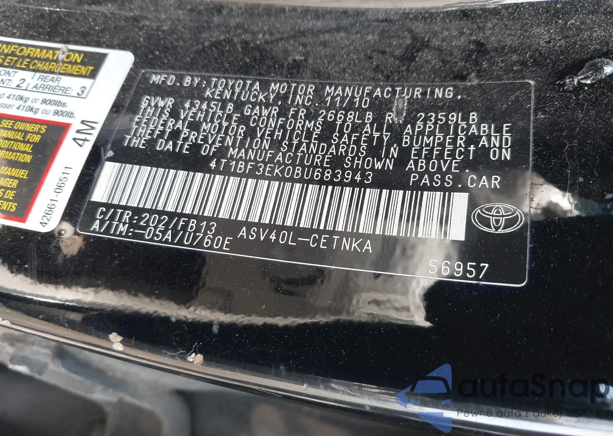 LOT: 42970592 VIN: 4T1BF3EK0BU683943