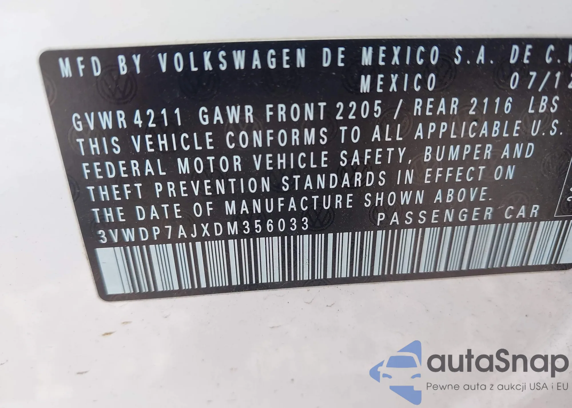 • VIN 3VWDP7AJXDM356033