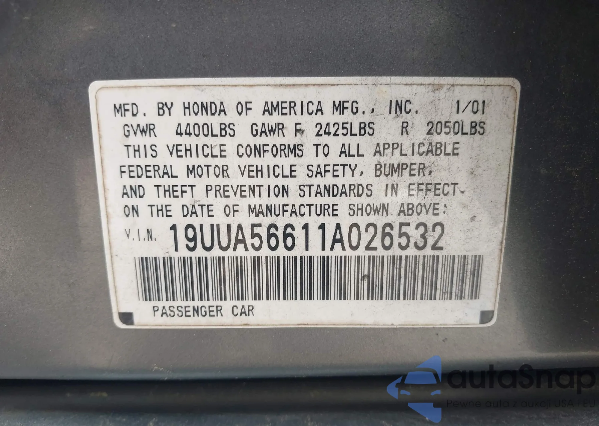 LOT: 42821196 VIN: 19UUA56611A026532