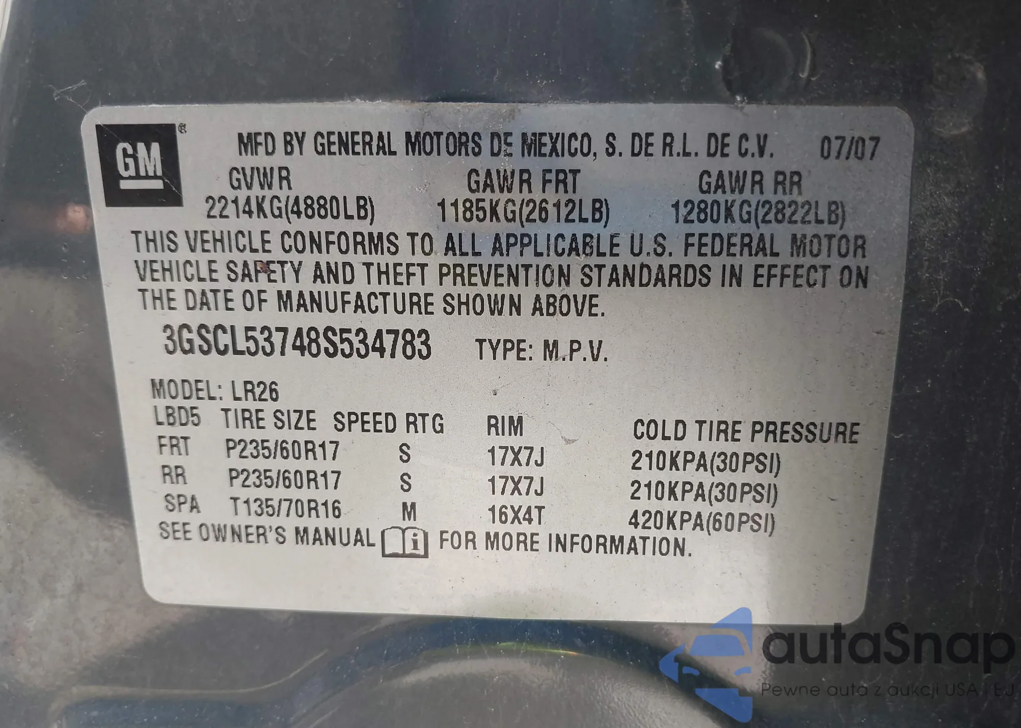 • VIN 3GSCL53748S534783