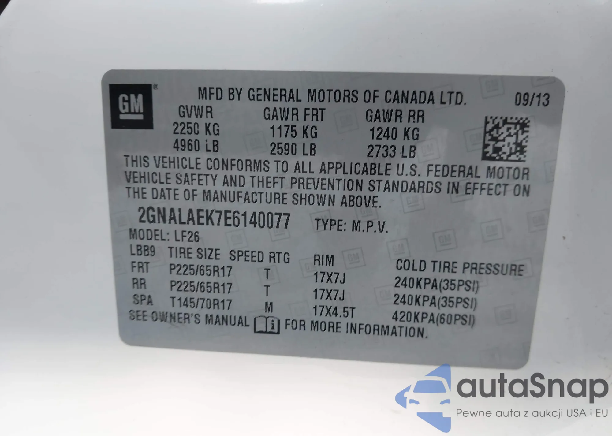 LOT: 43017011 VIN: 2G1FA1E32D9238050