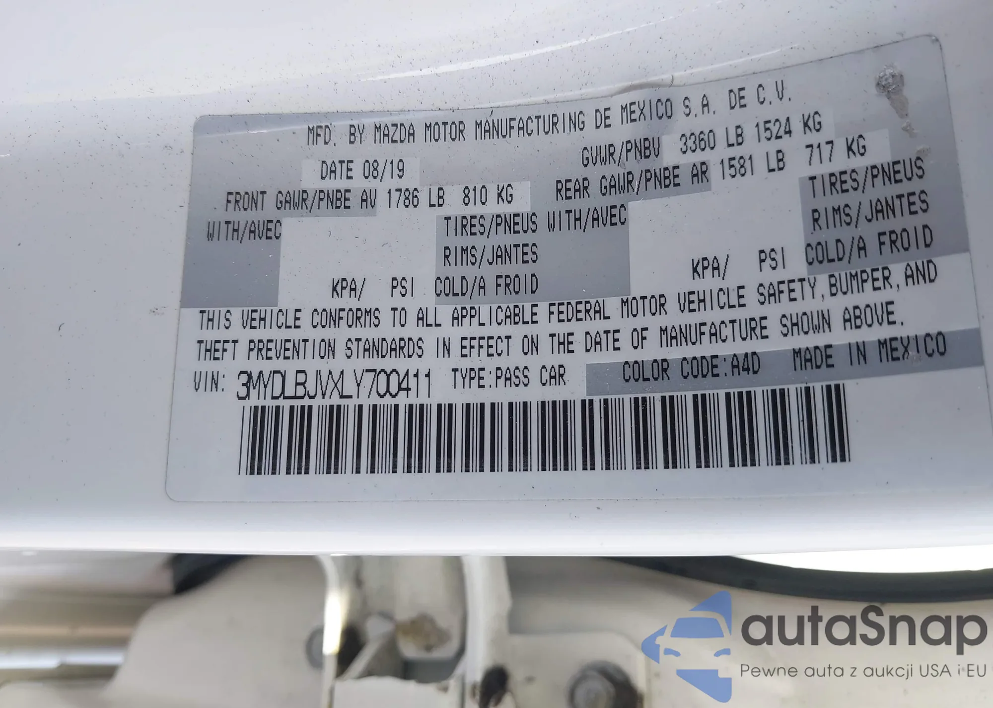 LOT: 42628525 VIN: 3MYDLBJVXLY700411