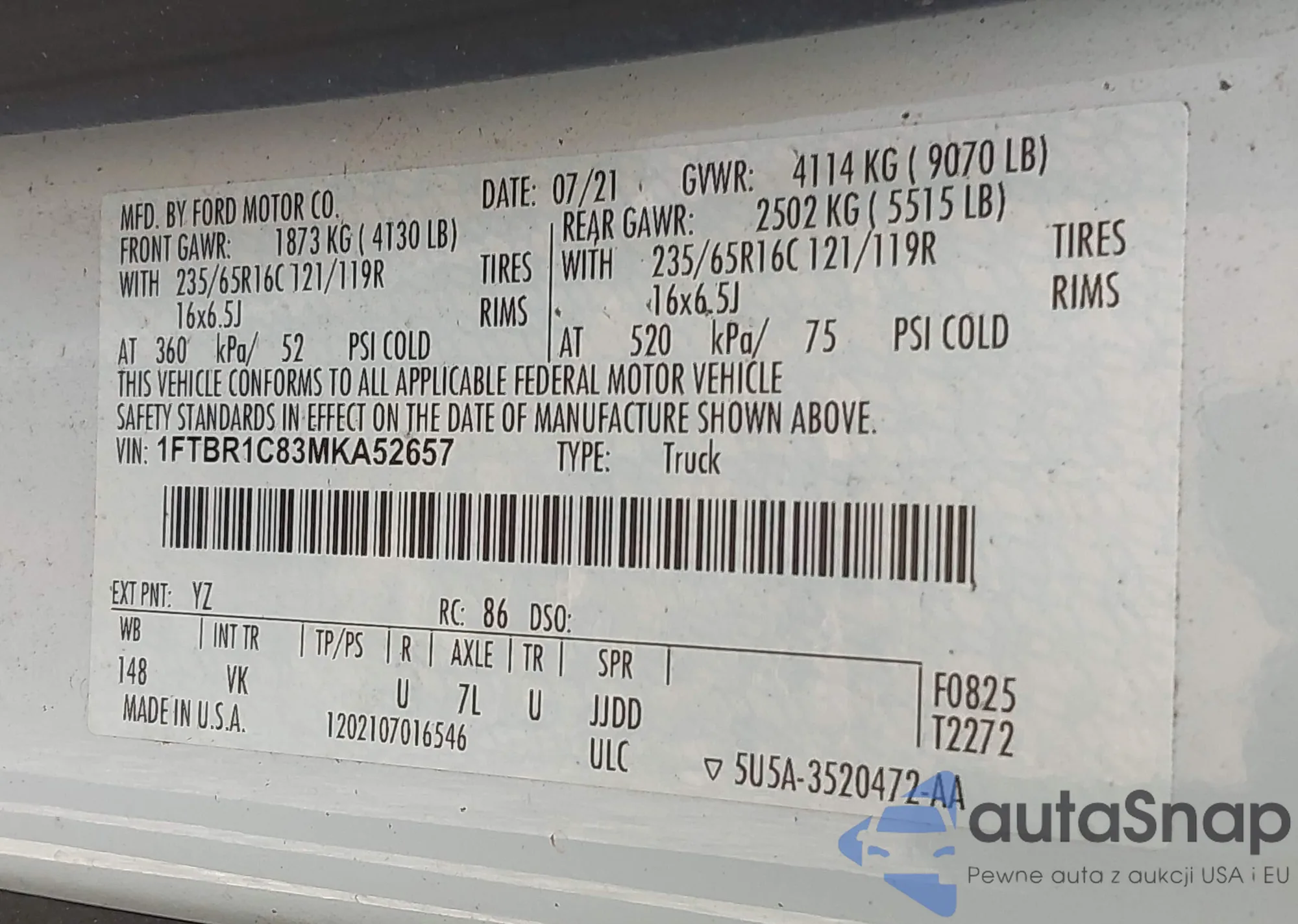 LOT: 42927479 VIN: 1FTBR1C83MKA52657