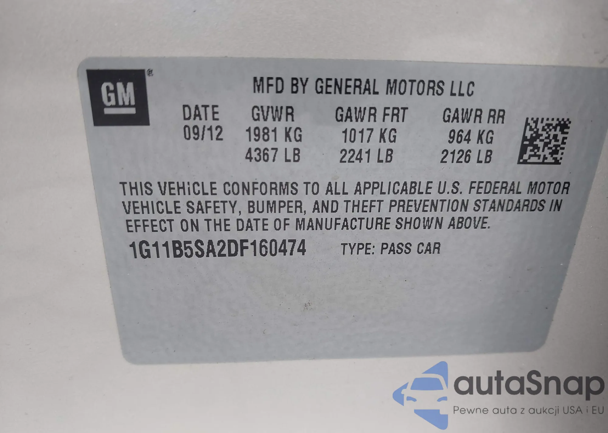 LOT: 43008727 VIN: 1G11B5SA2DF160474
