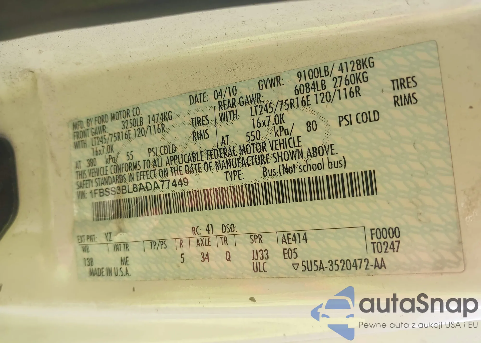 • VIN 1FBSS3BL8ADA77449