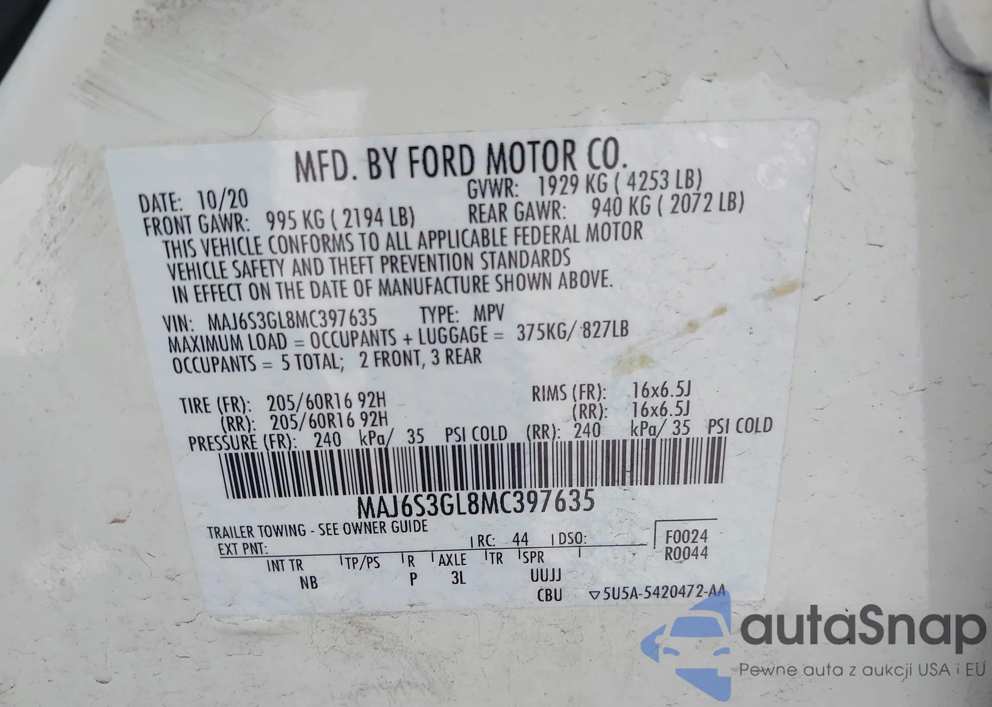 • VIN MAJ6S3GL8MC397635