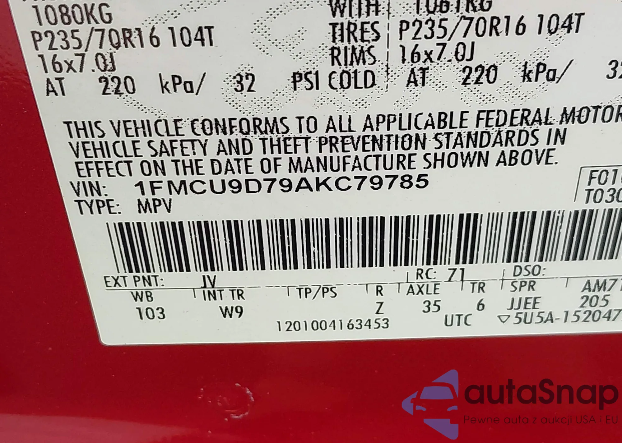 • VIN 1FMCU9D79AKC79785