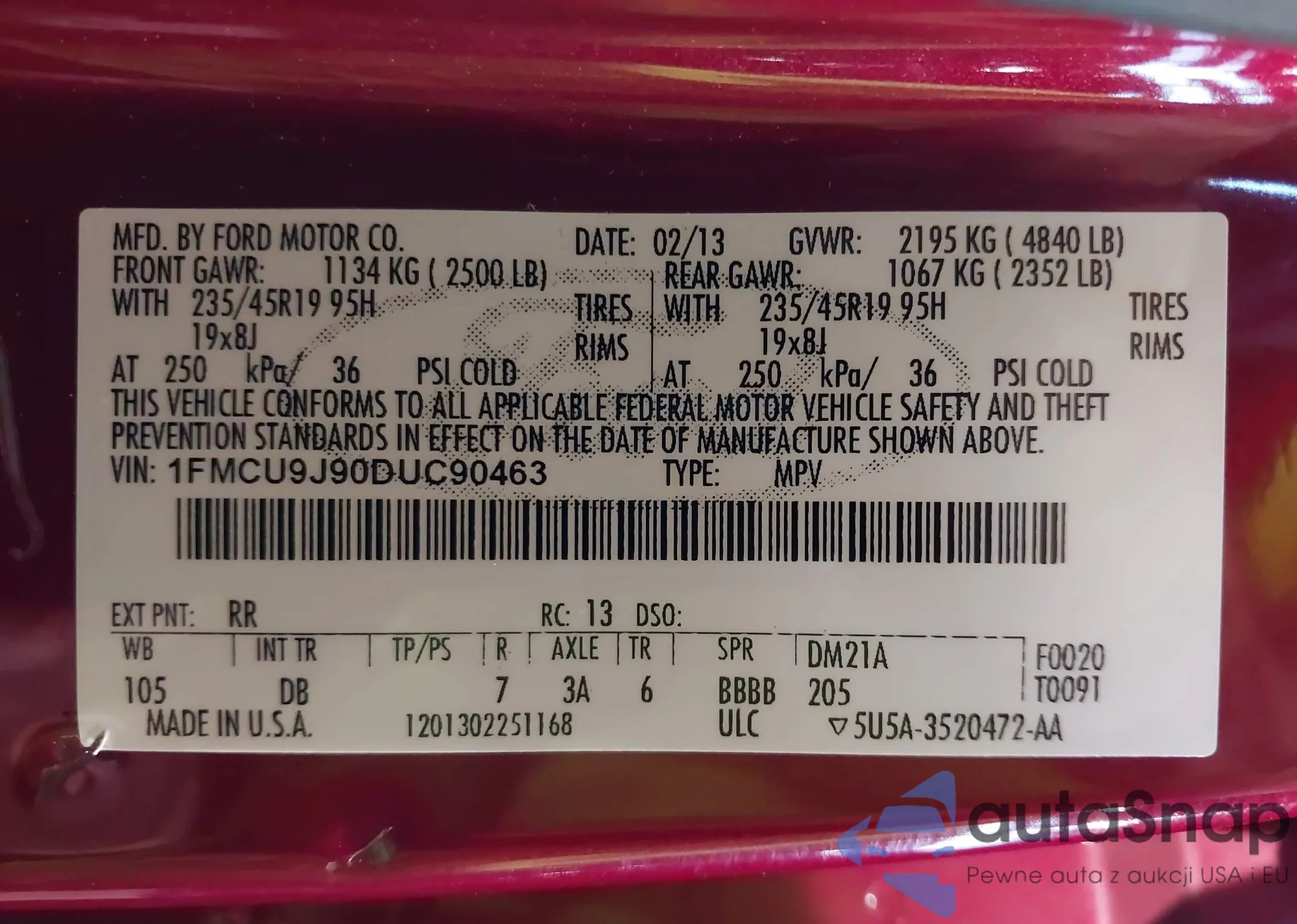 • VIN 1FMCU9J90DUC90463