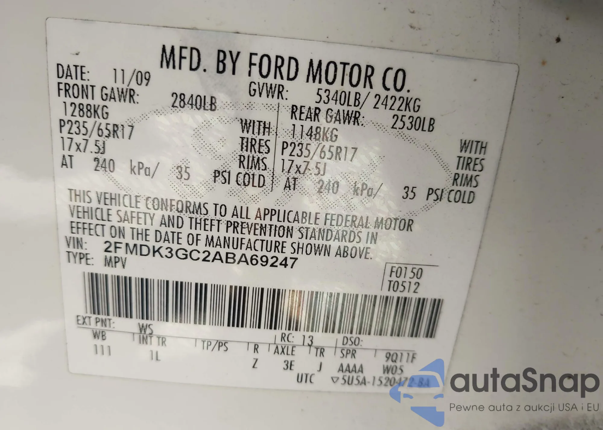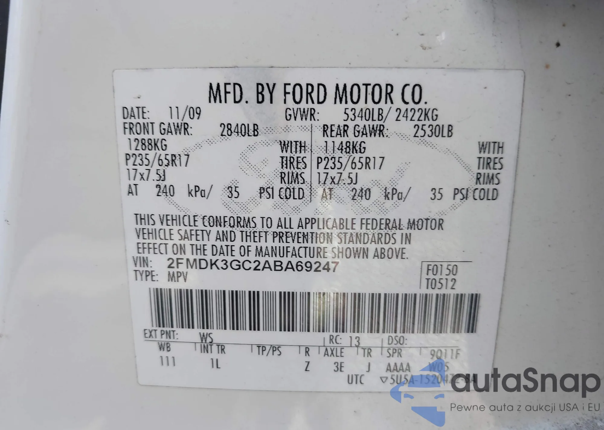LOT: 42549122 VIN: 2FMDK3GC2ABA69247
