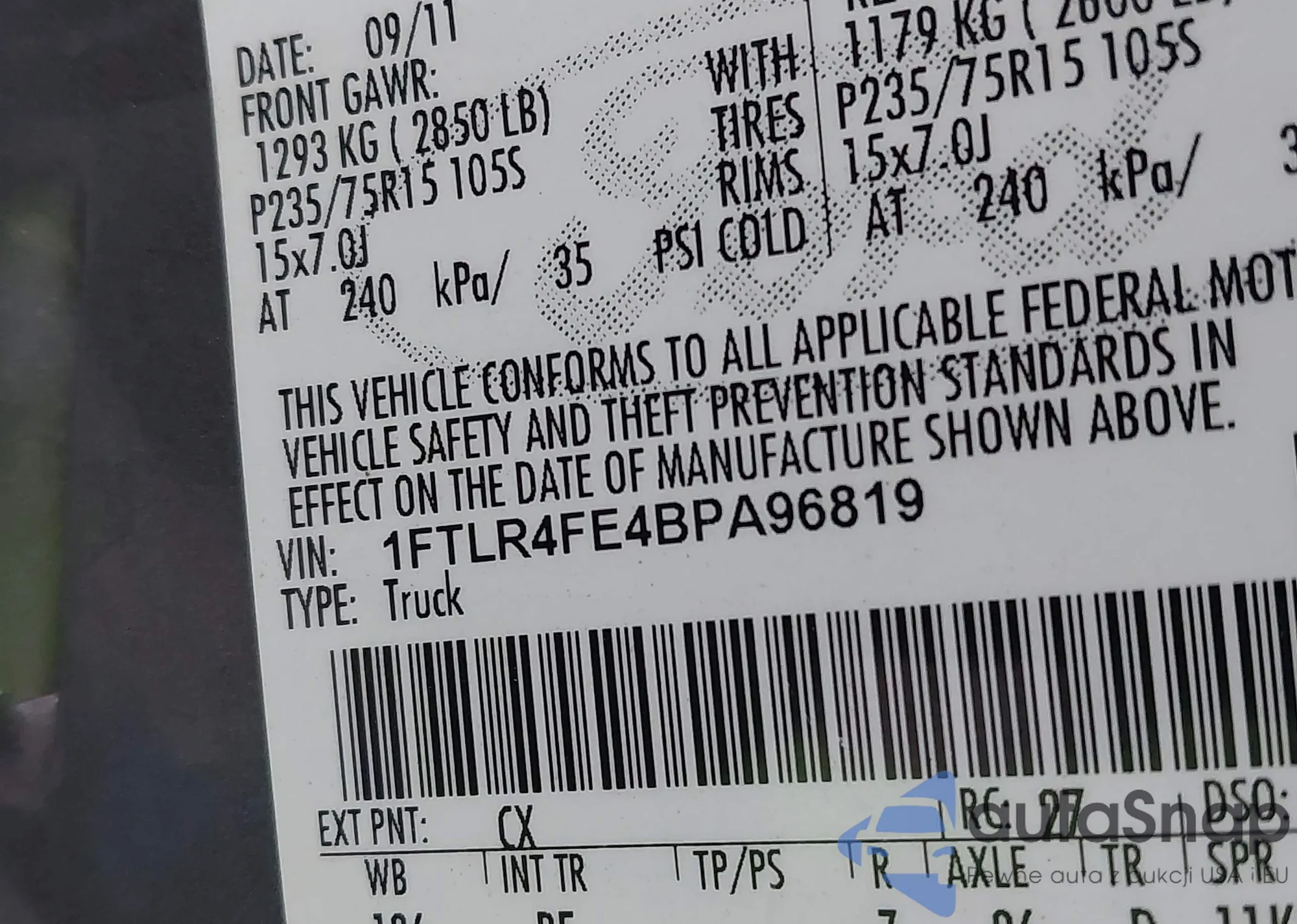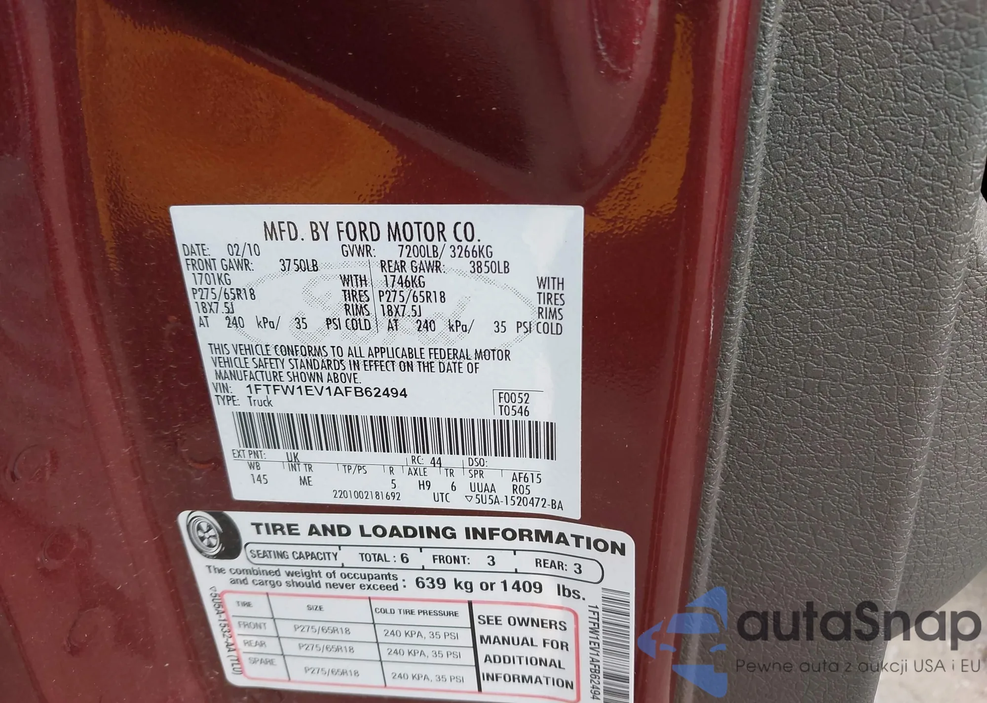 • VIN 1FTFW1EV1AFB62494