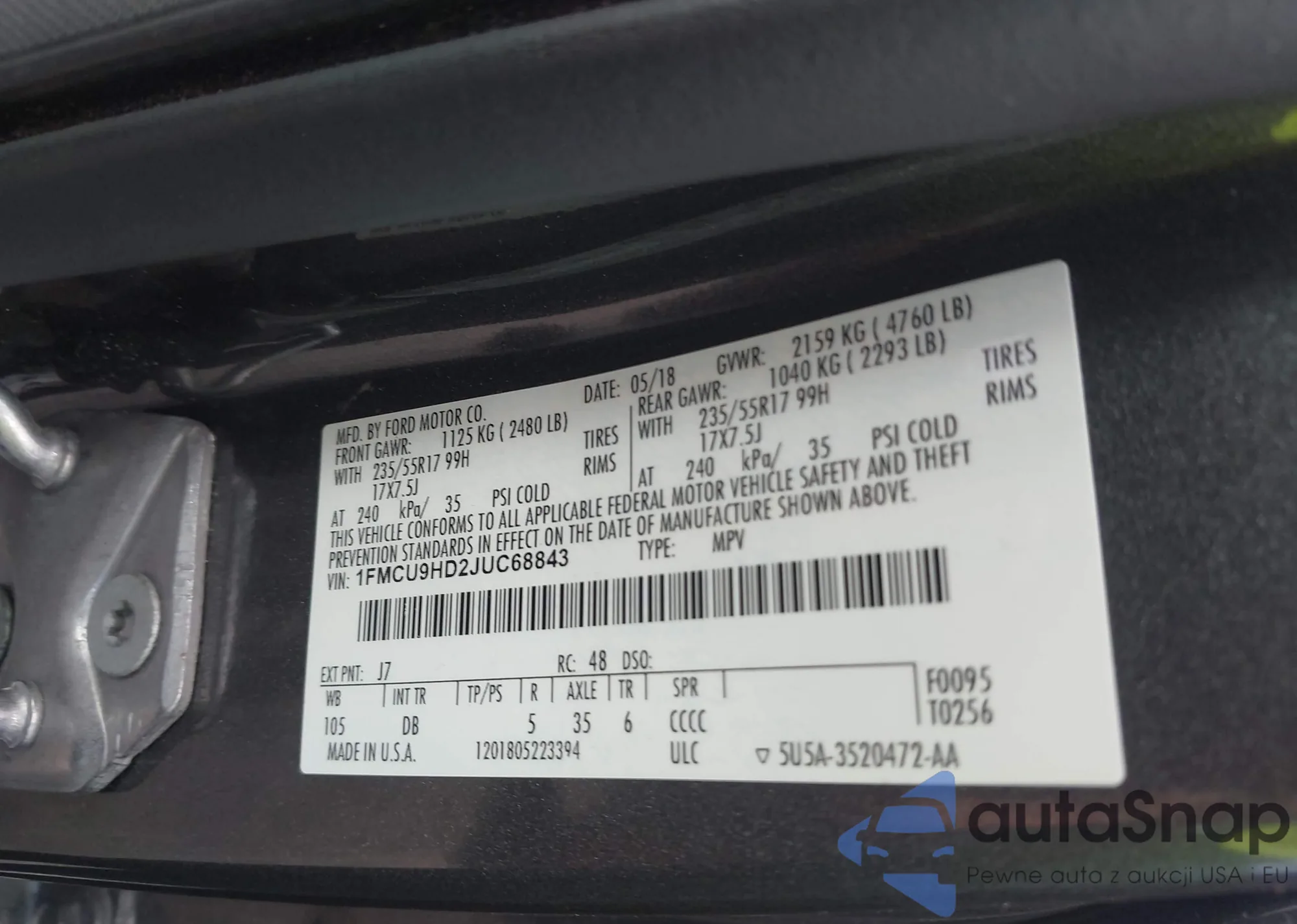 • VIN 1FMCU9HD2JUC68843