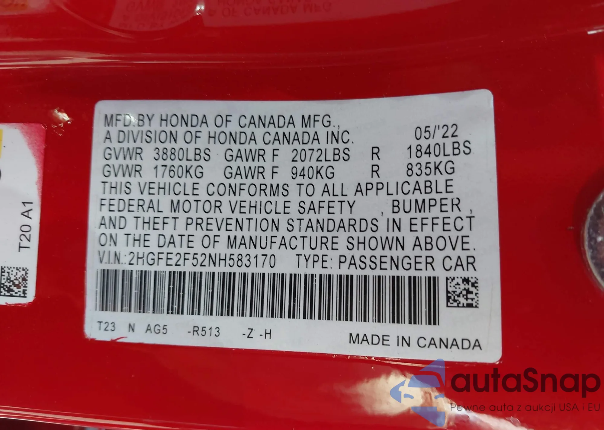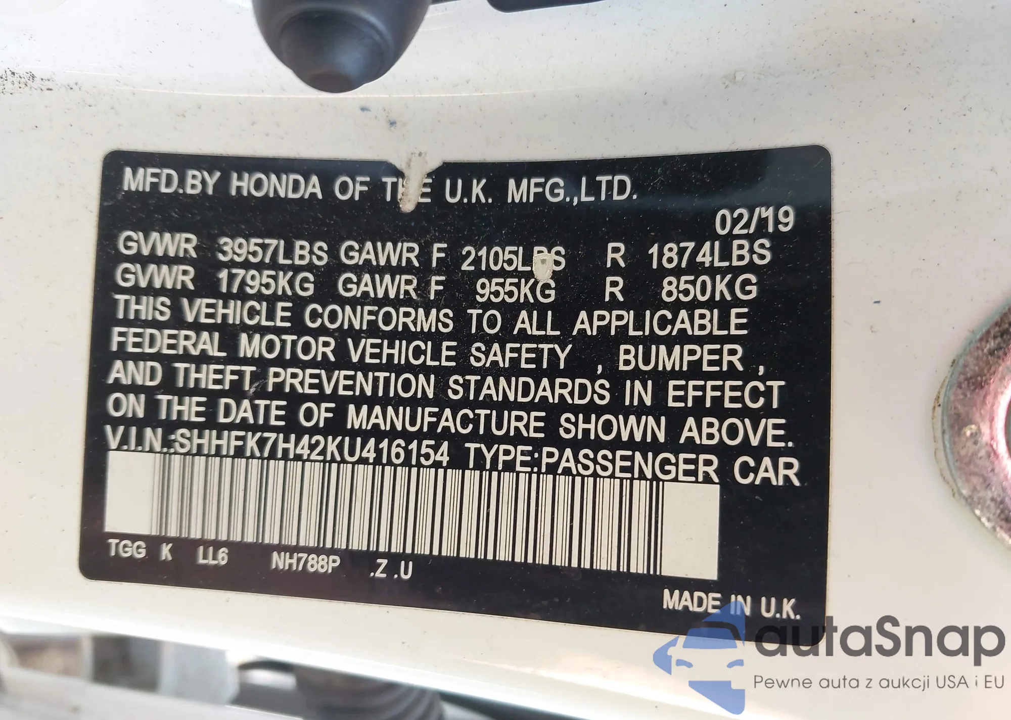 LOT: 42535565 VIN: SHHFK7H42KU416154