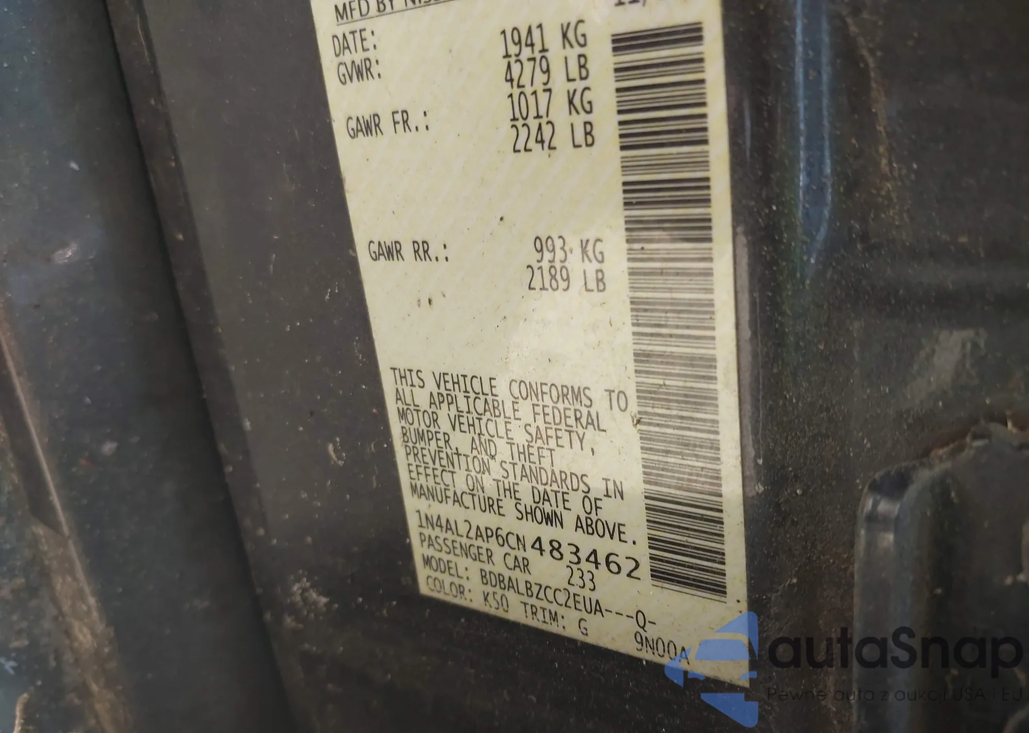 • VIN 1N4AL2AP6CN483462