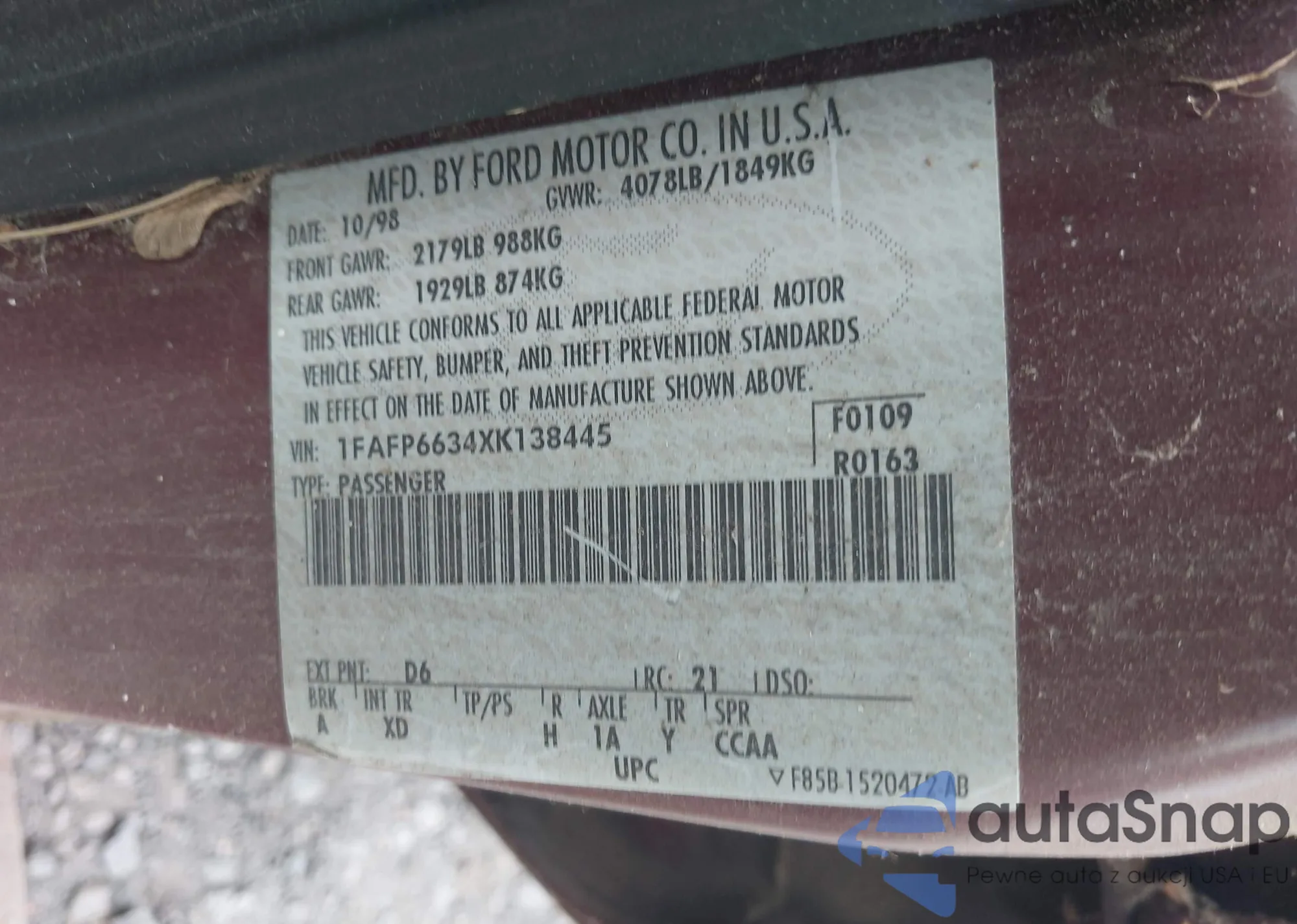 • VIN 1FAFP6634XK138445