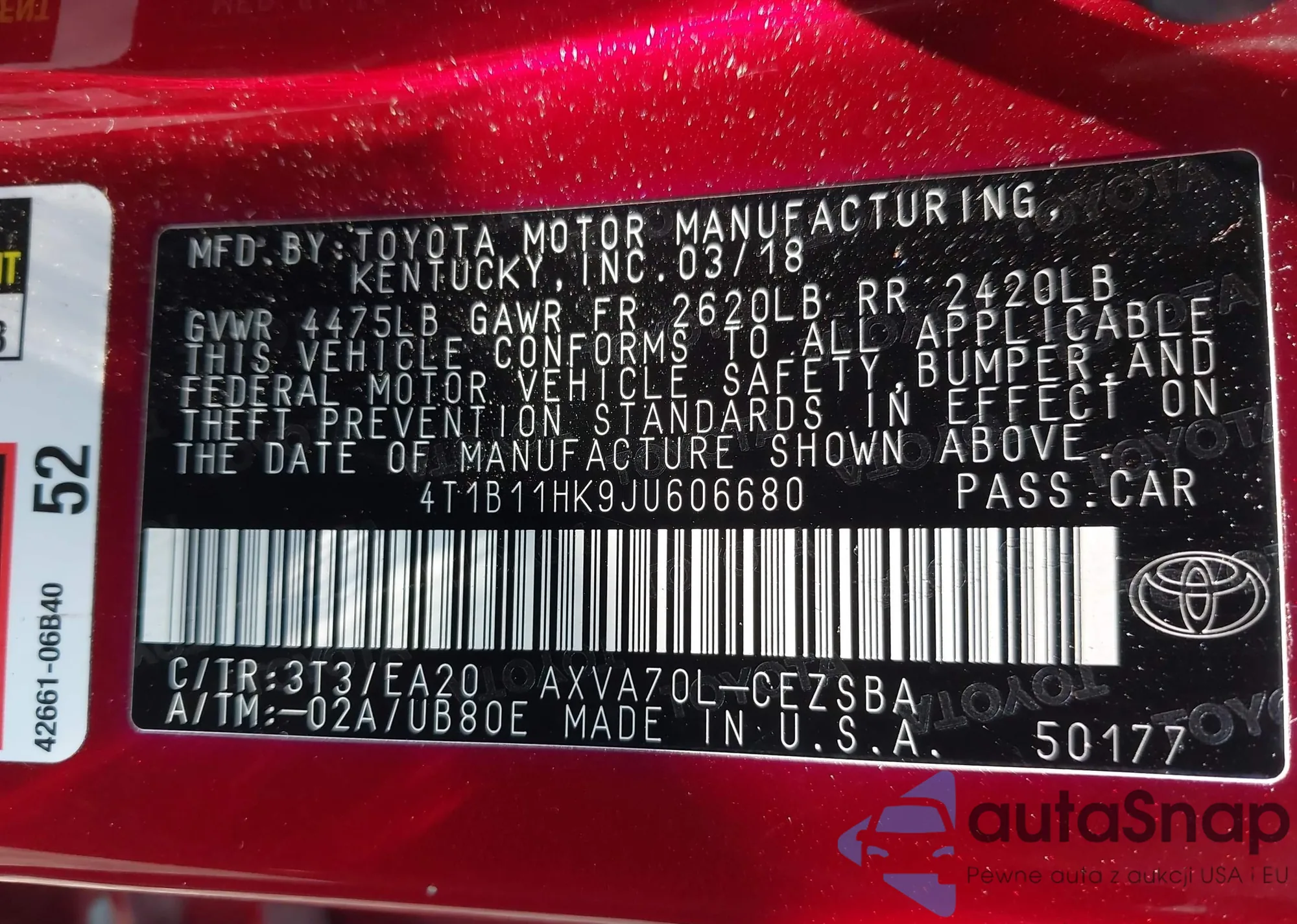 LOT: 42908327 VIN: 4T1B11HK9JU606680