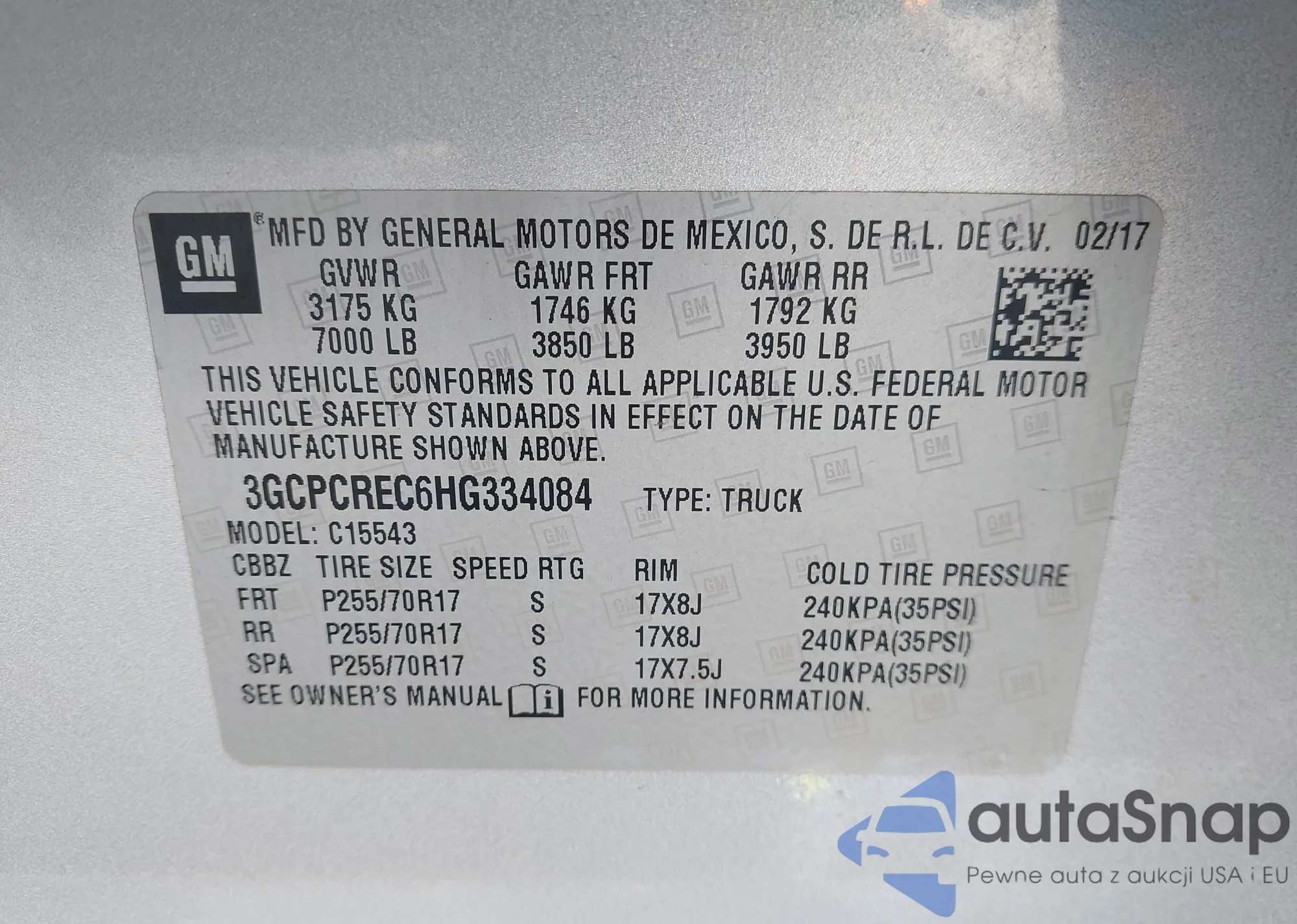 LOT: 42551692 VIN: 3GCPCREC6HG334084