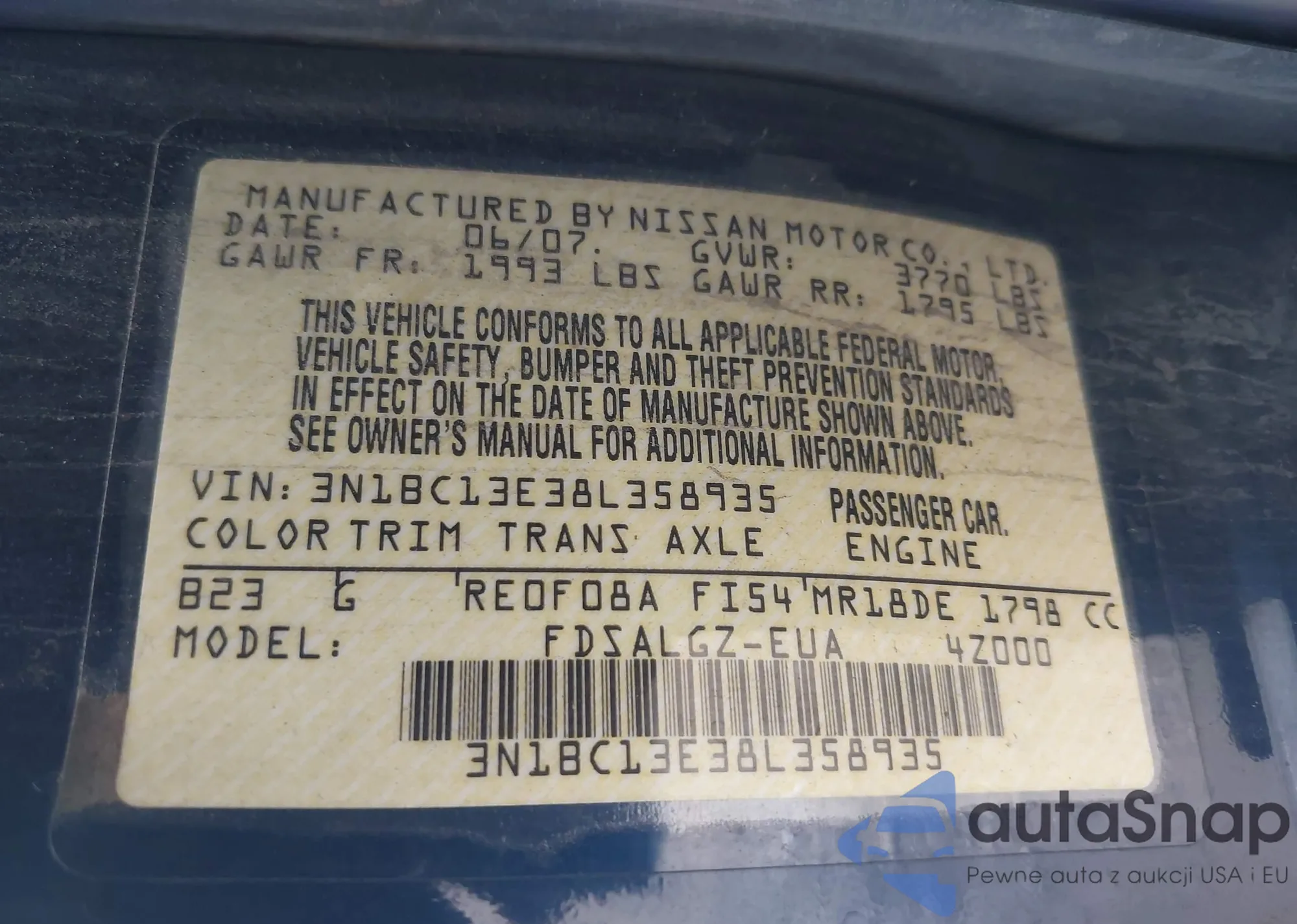 • VIN 3N1BC13E38L358935