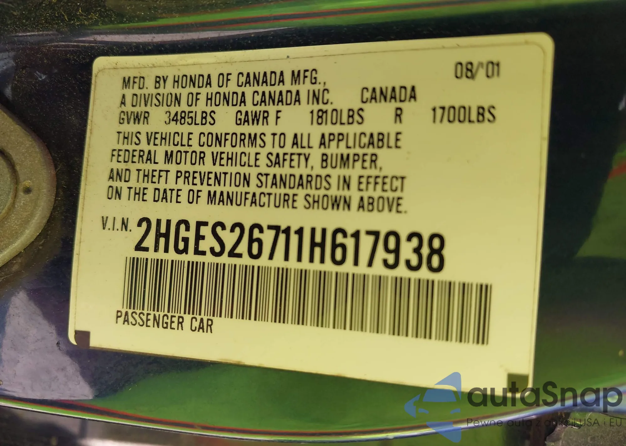 • VIN 2HGES26711H617938