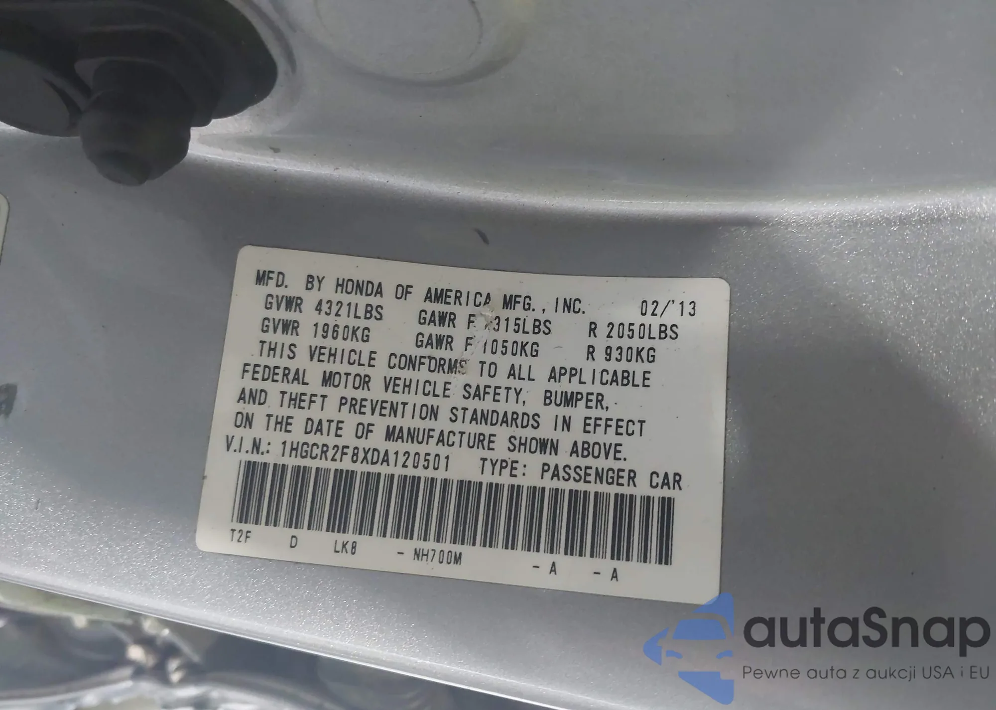 • VIN 1HGCR2F8XDA120501