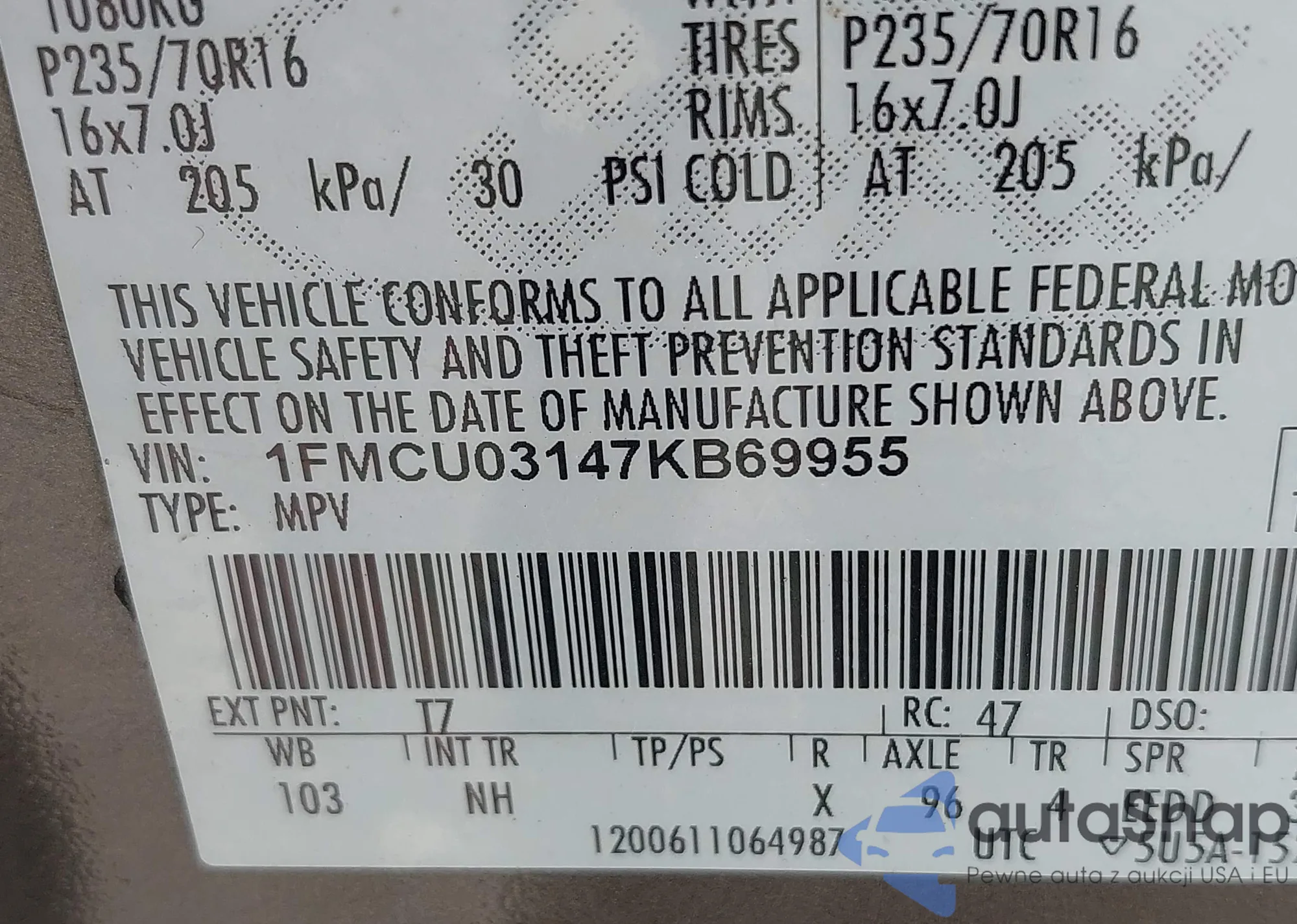 • VIN 1FMCU03147KB69955
