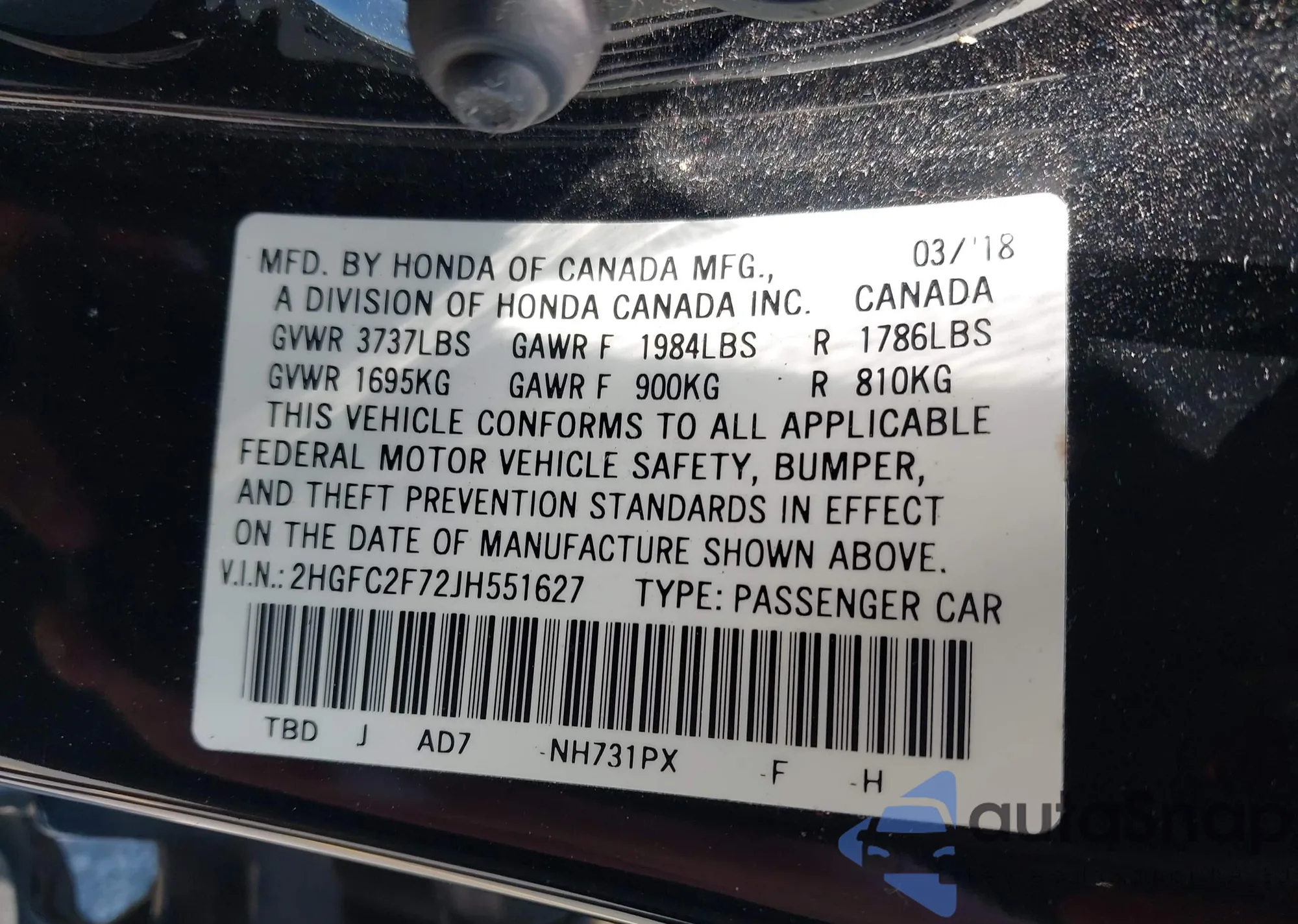 LOT: 42591642 VIN: 2HGFC2F72JH551627