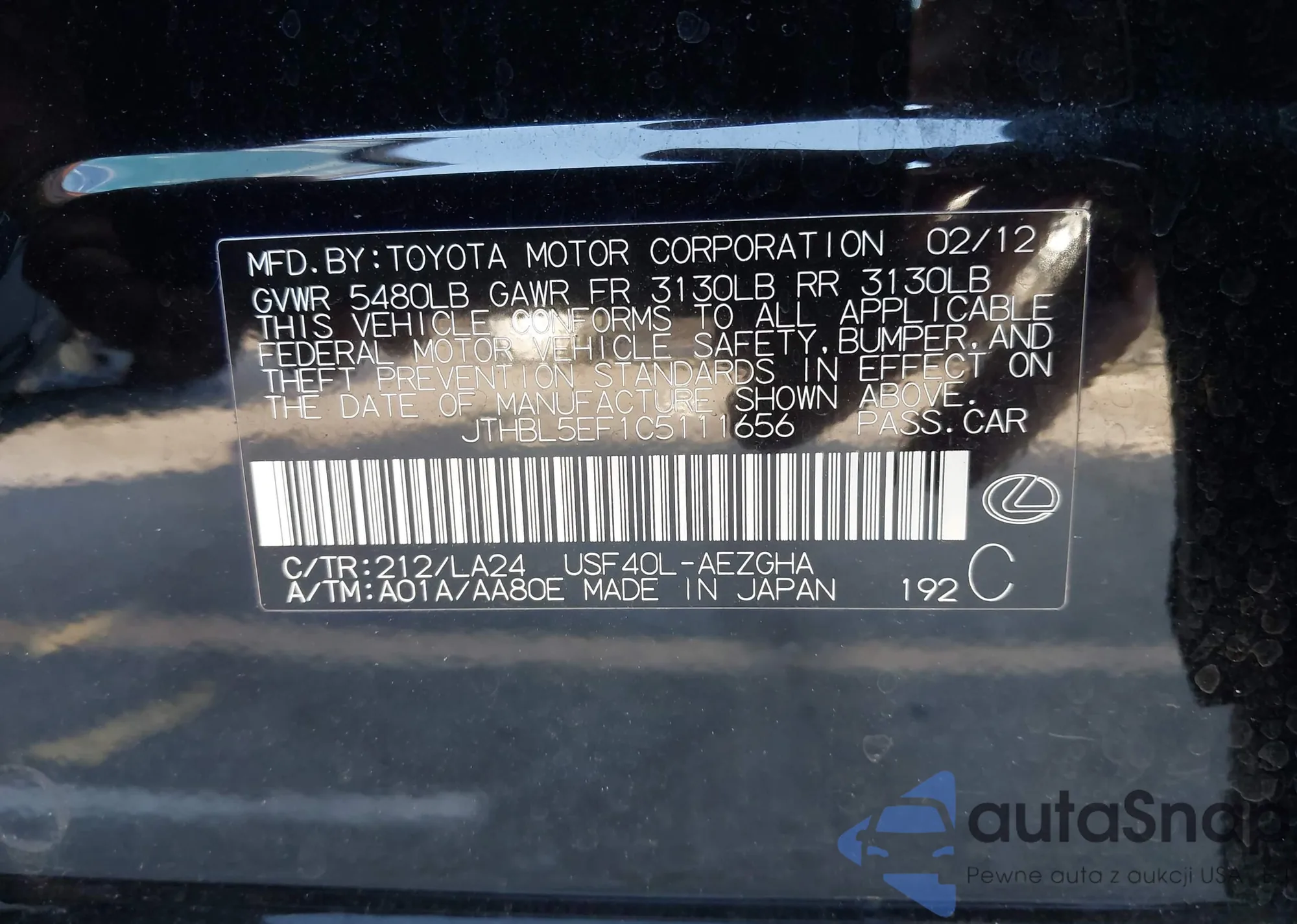 LOT: 42796793 VIN: JTHBL5EF1C5111656