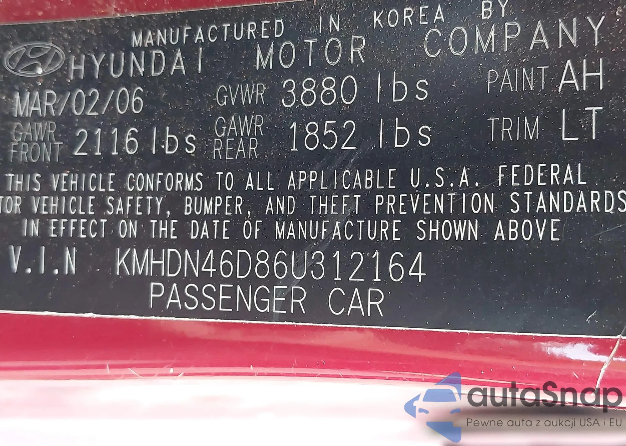 LOT: 42890544 VIN: KMHDN46D86U312164
