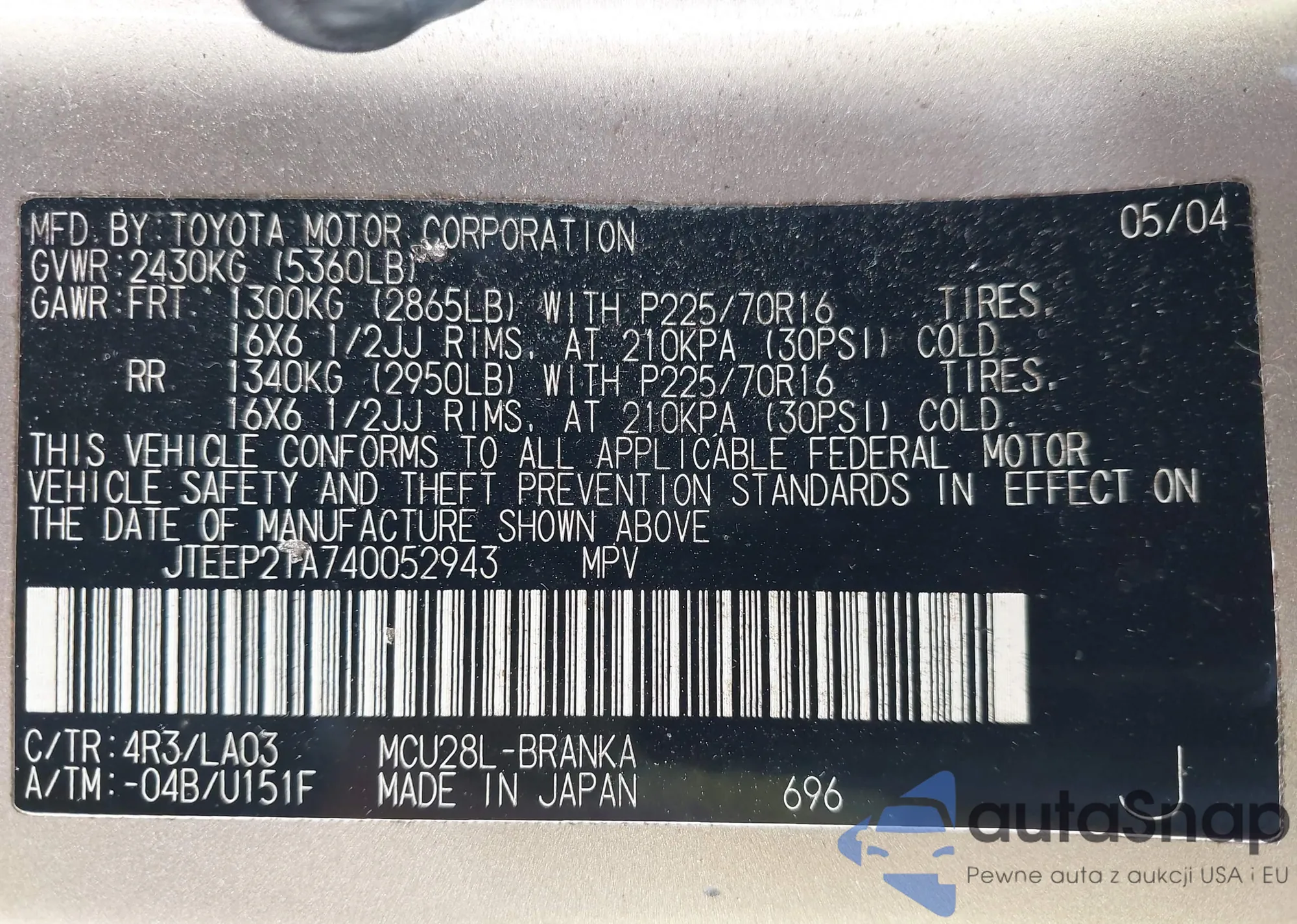 LOT: 42922335 VIN: JTEEP21A740052943