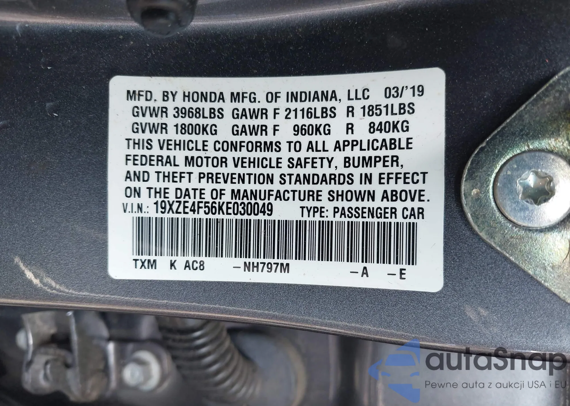 LOT: 42977567 VIN: 19XZE4F56KE030049