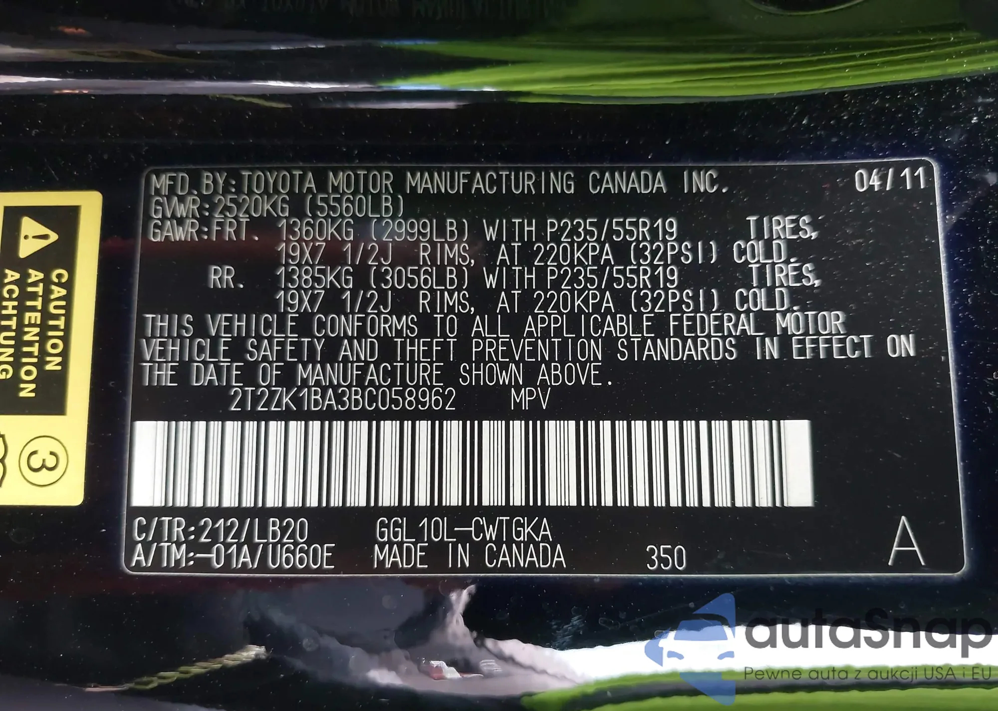 • VIN 2T2ZK1BA3BC058962