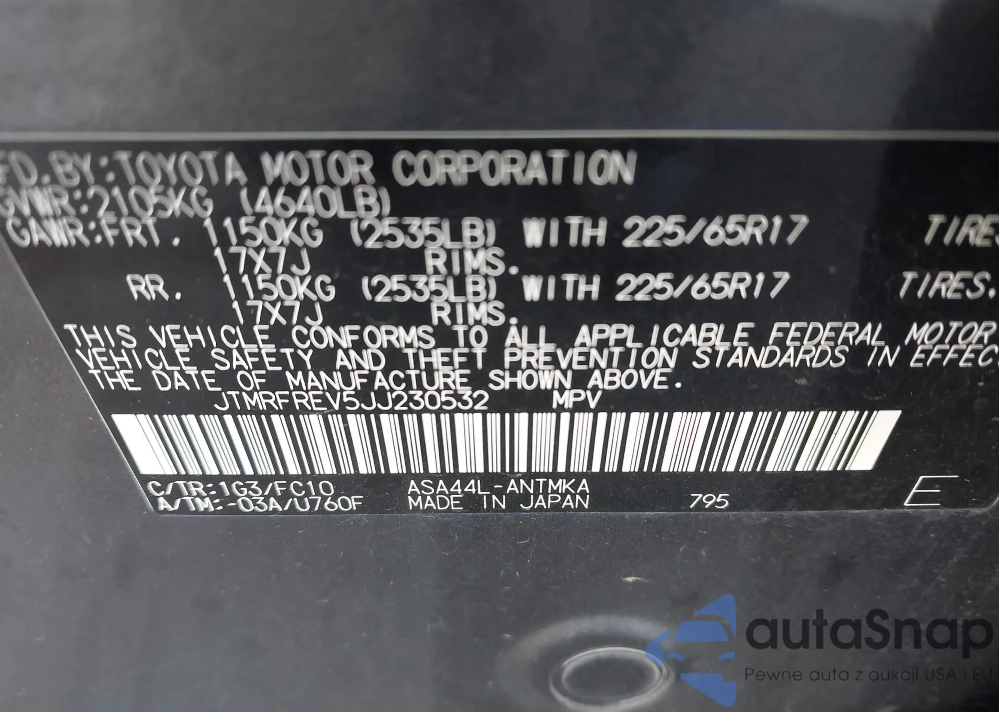 LOT: 42660737 VIN: JTMRFREV5JJ230532