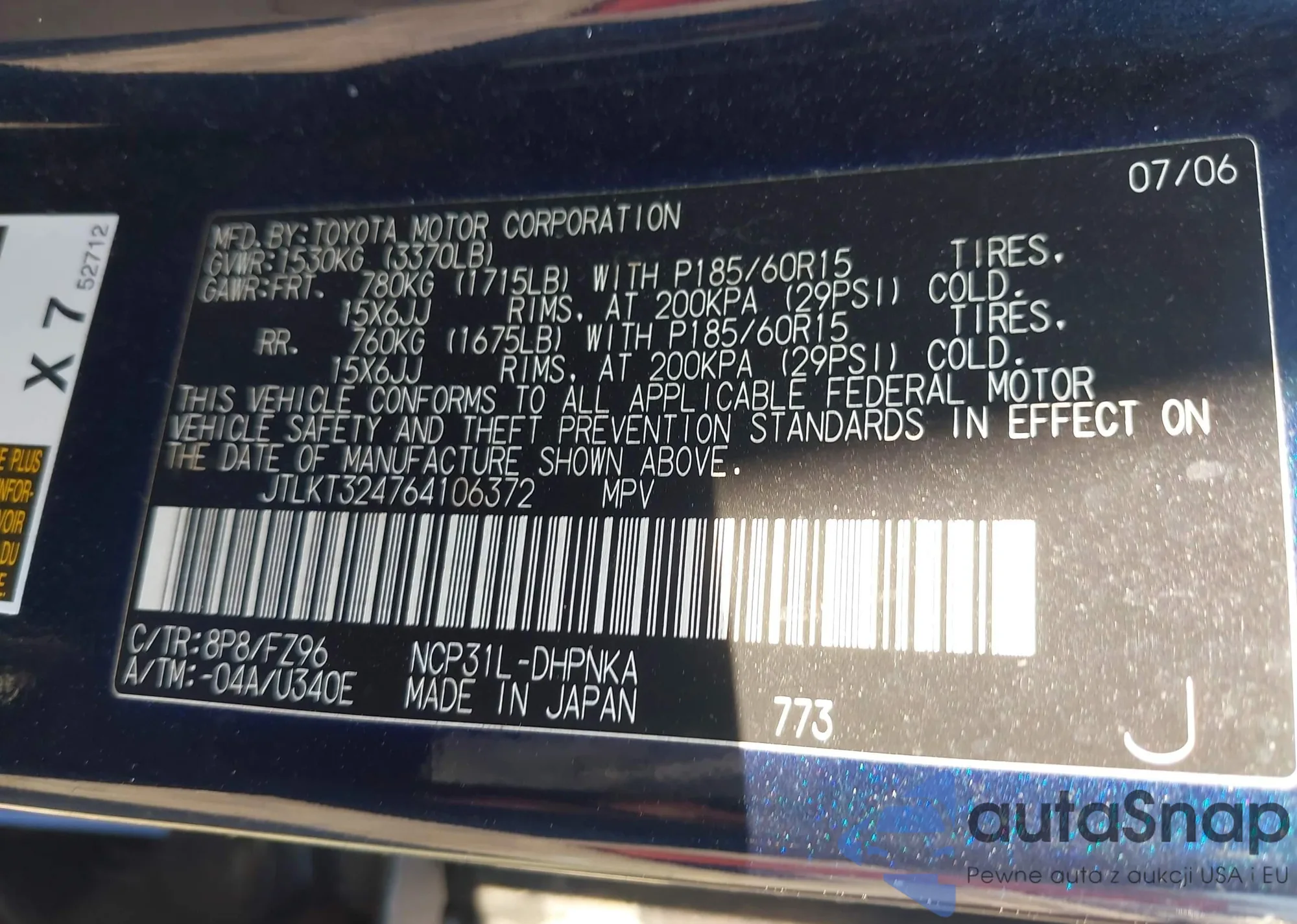 LOT: 42847155 VIN: JTLKT324764106372