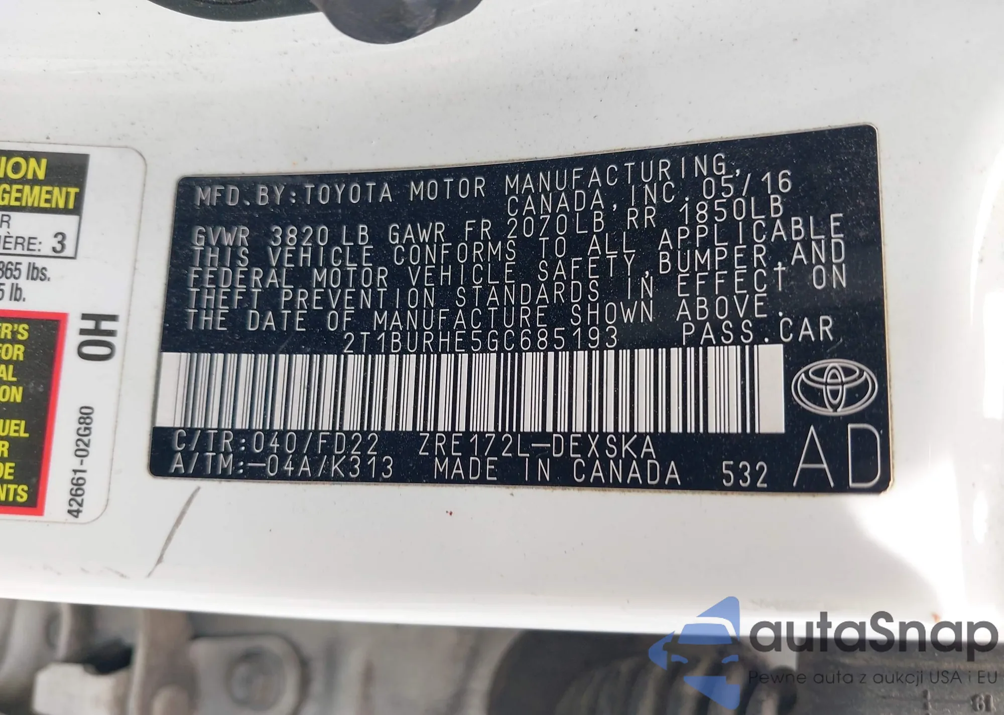 LOT: 42905002 VIN: 2T1BURHE5GC685193