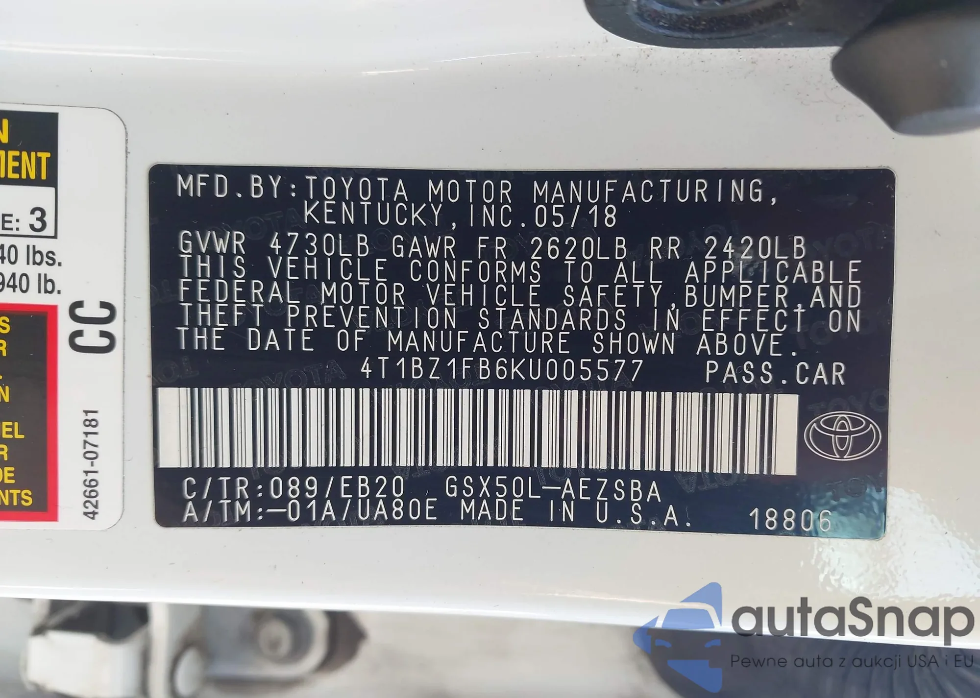 • VIN 4T1BZ1FB6KU005577