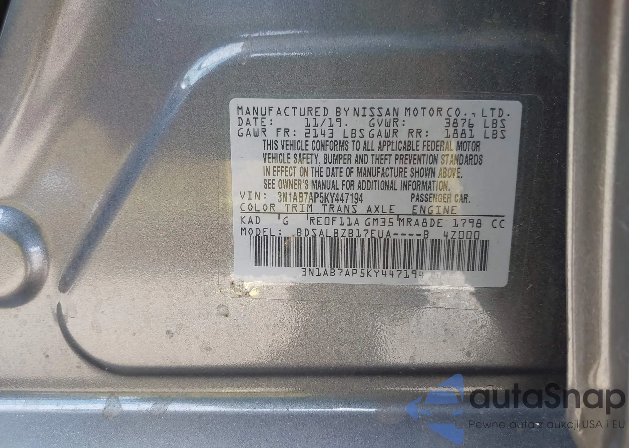 LOT: 42656080 VIN: 3N1AB7AP5KY447194
