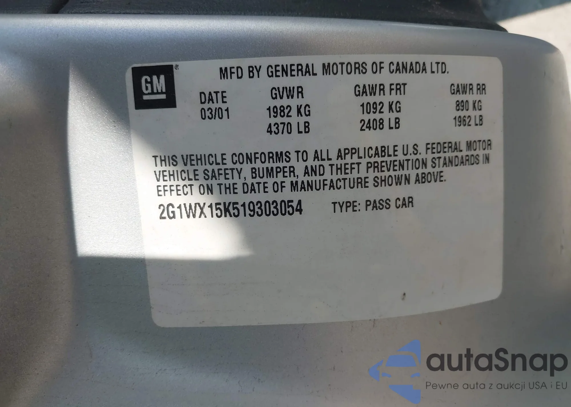 LOT: 42992101 VIN: 2G1WX15K519303054