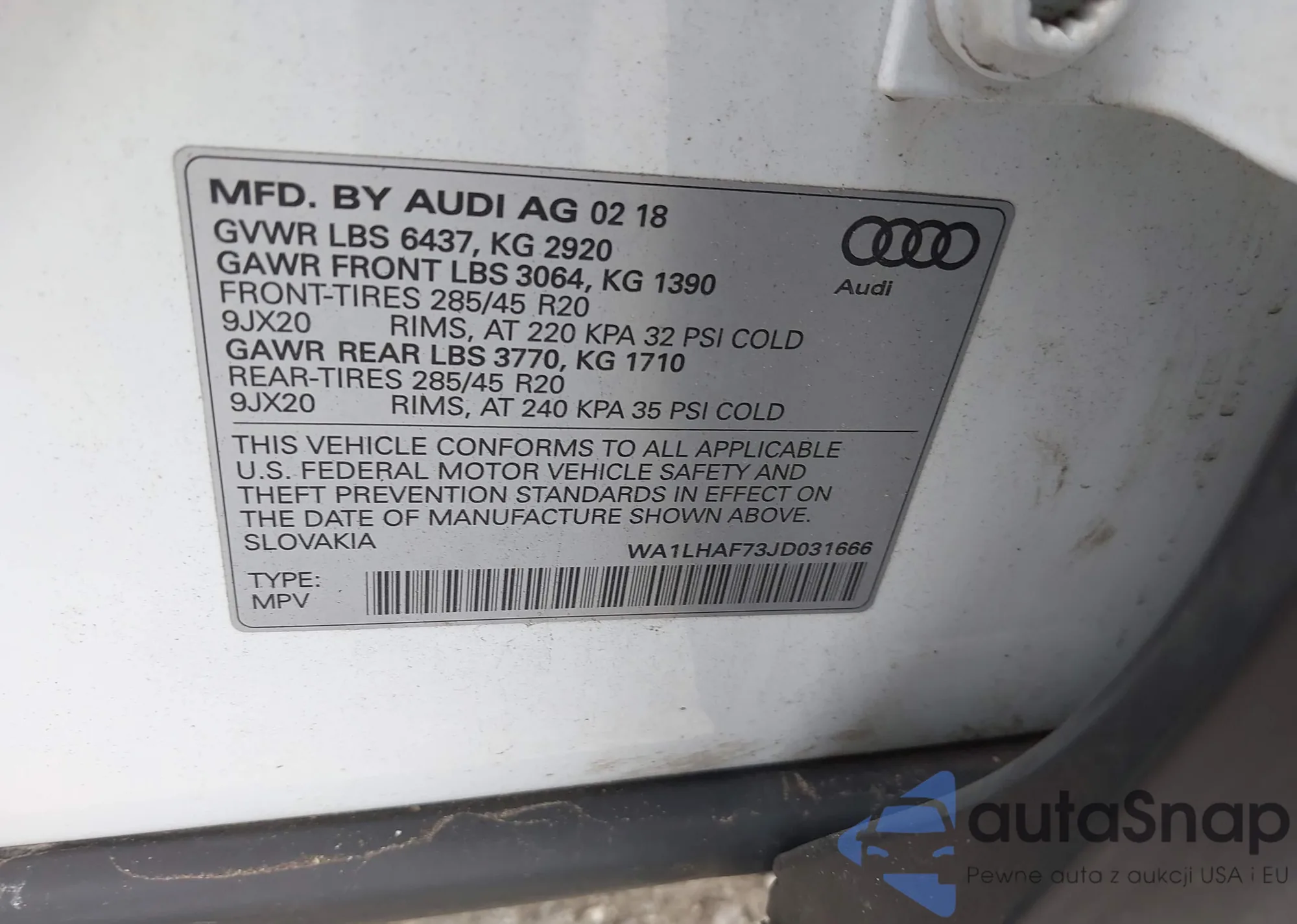 LOT: 42400628 VIN: WA1LHAF73JD031666