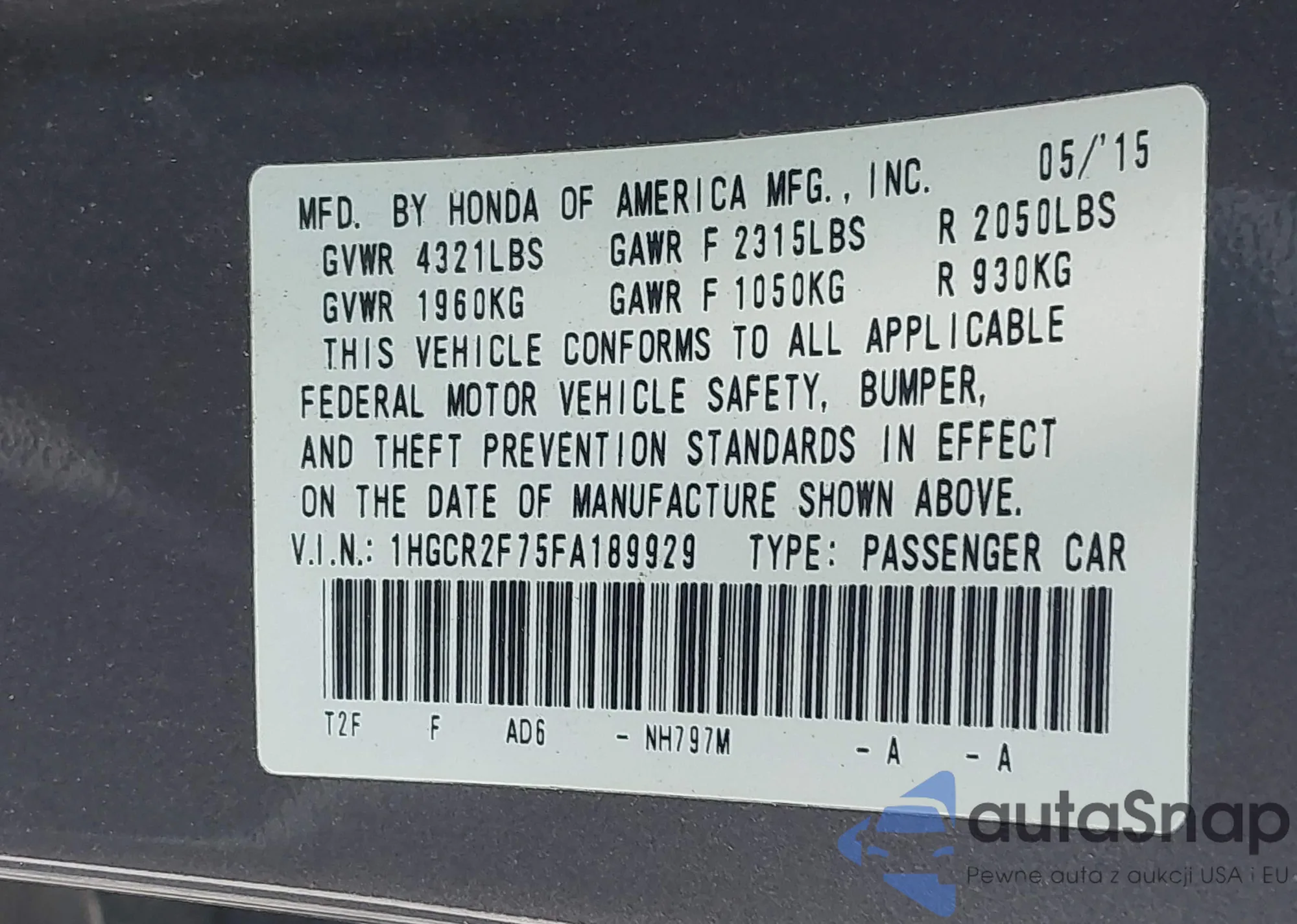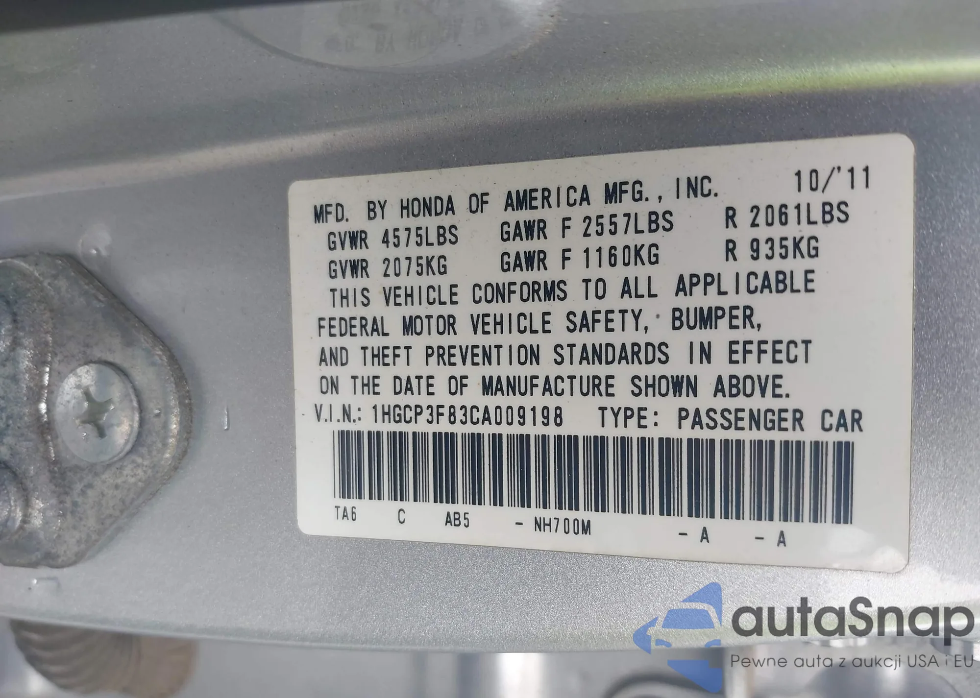 LOT: 42497266 VIN: 1HGCP3F83CA009198
