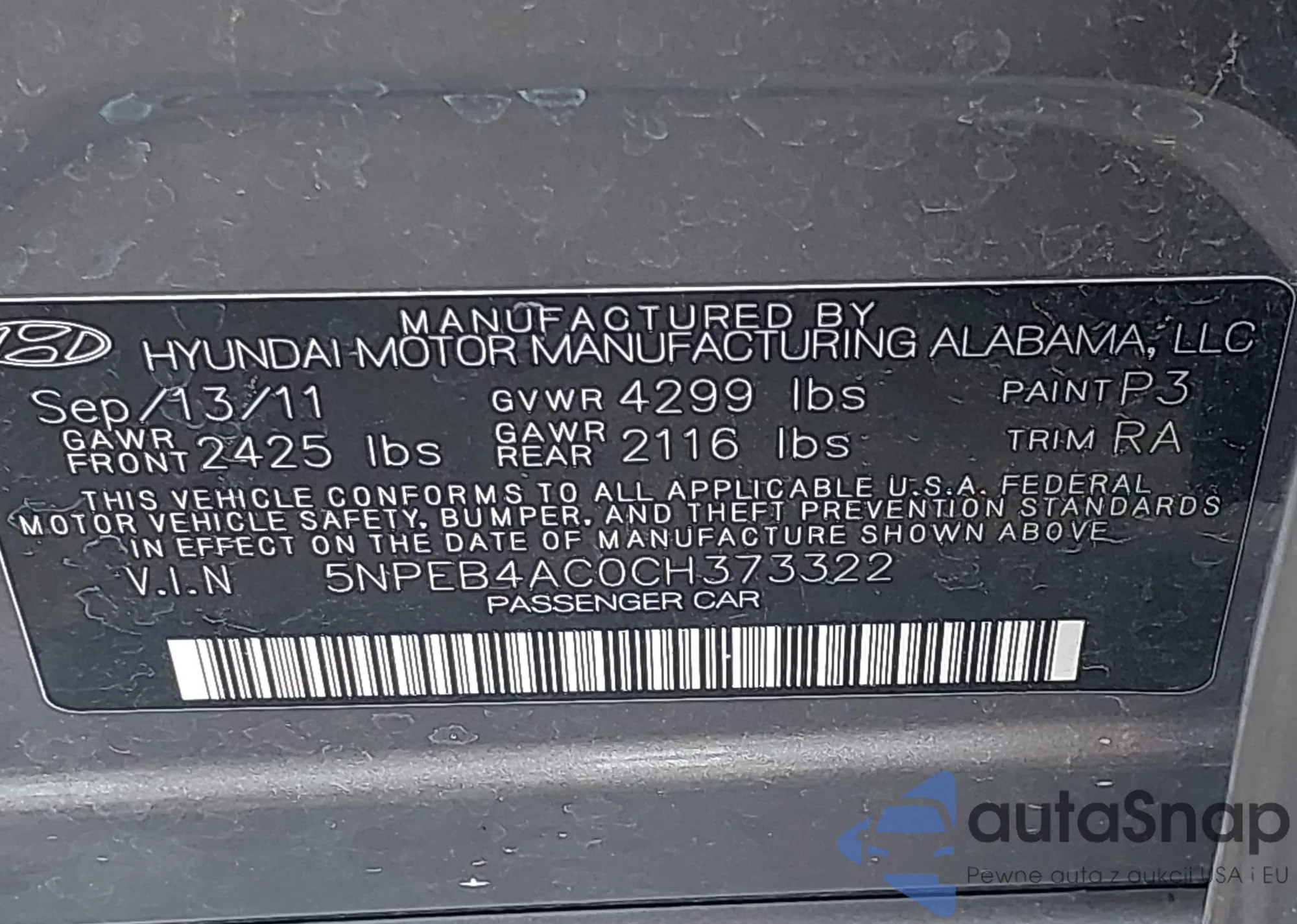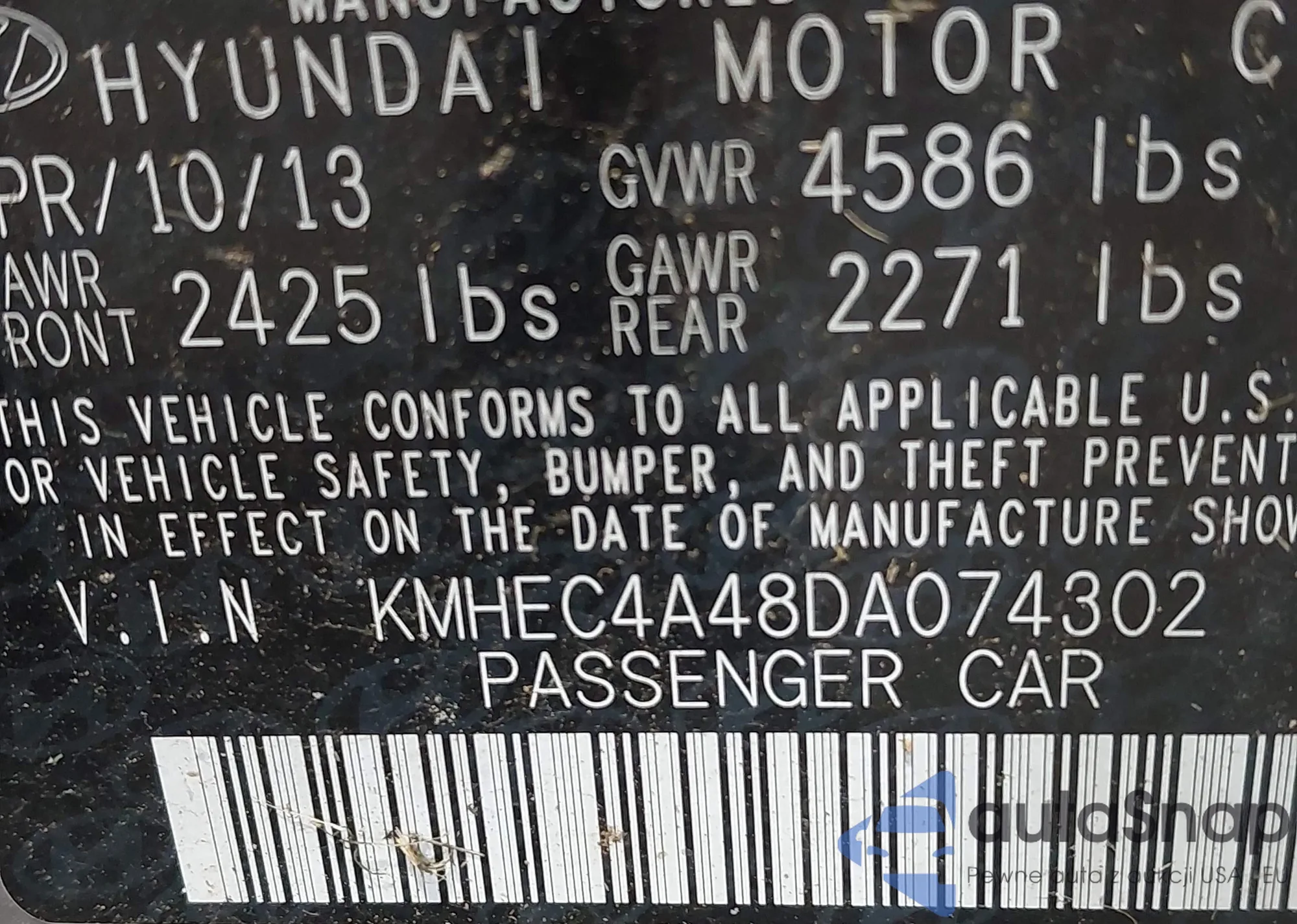 LOT: 42869475 VIN: KMHEC4A48DA074302