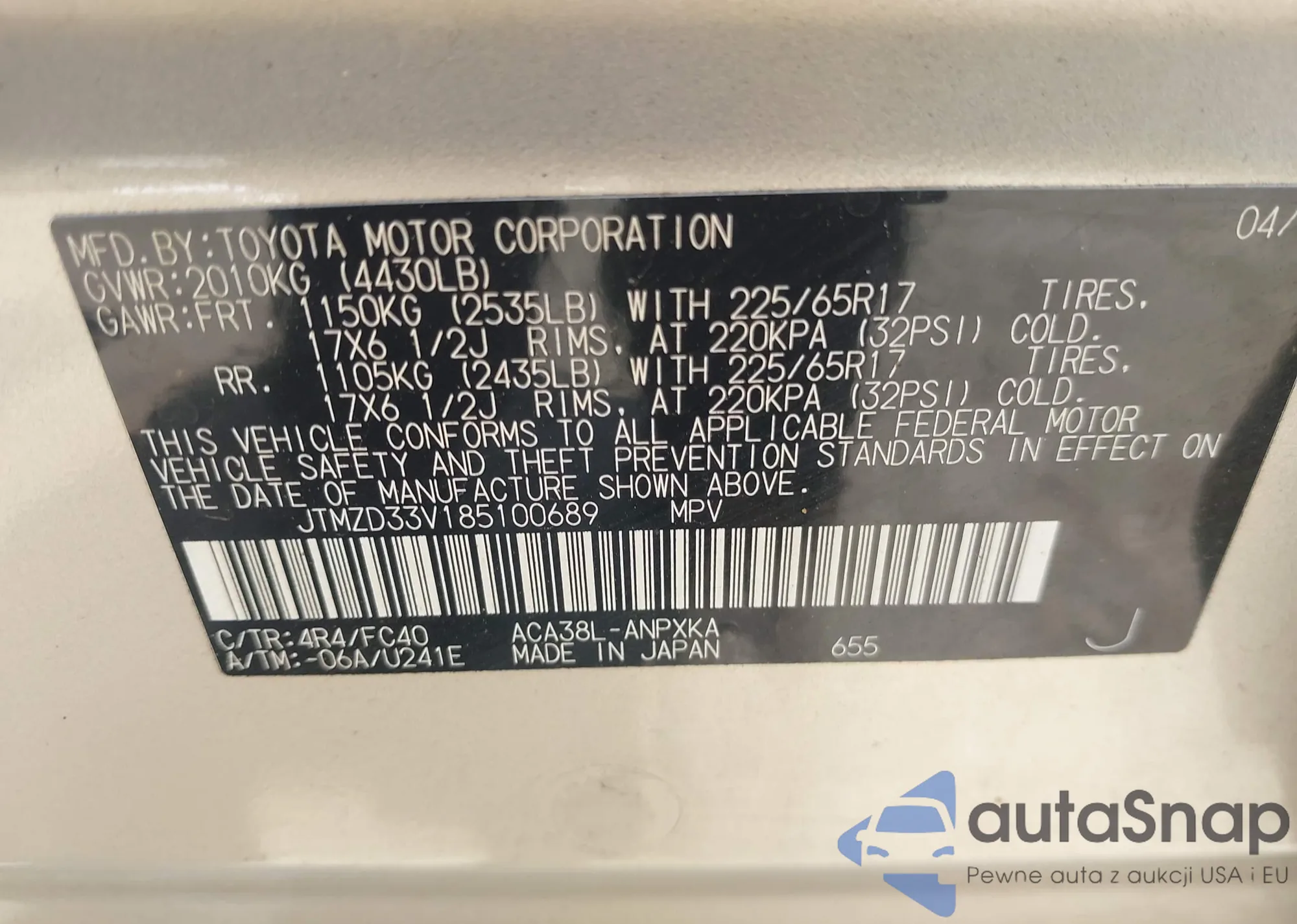 • VIN 4T3LWRFV8RU130278