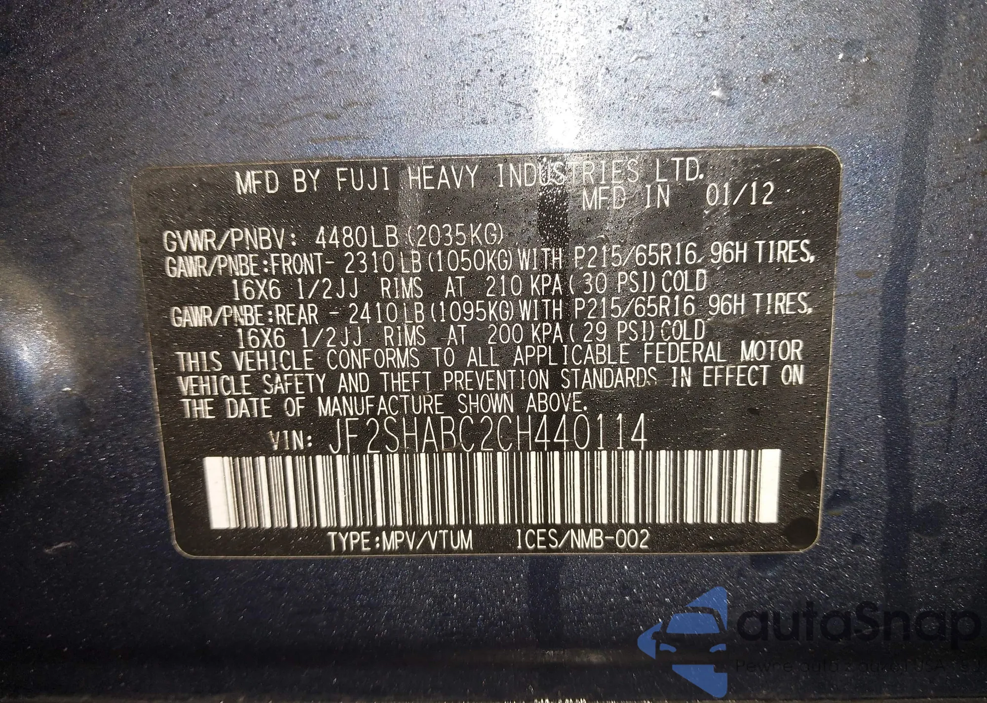 LOT: 41142984 VIN: JF2SHABC2CH440114