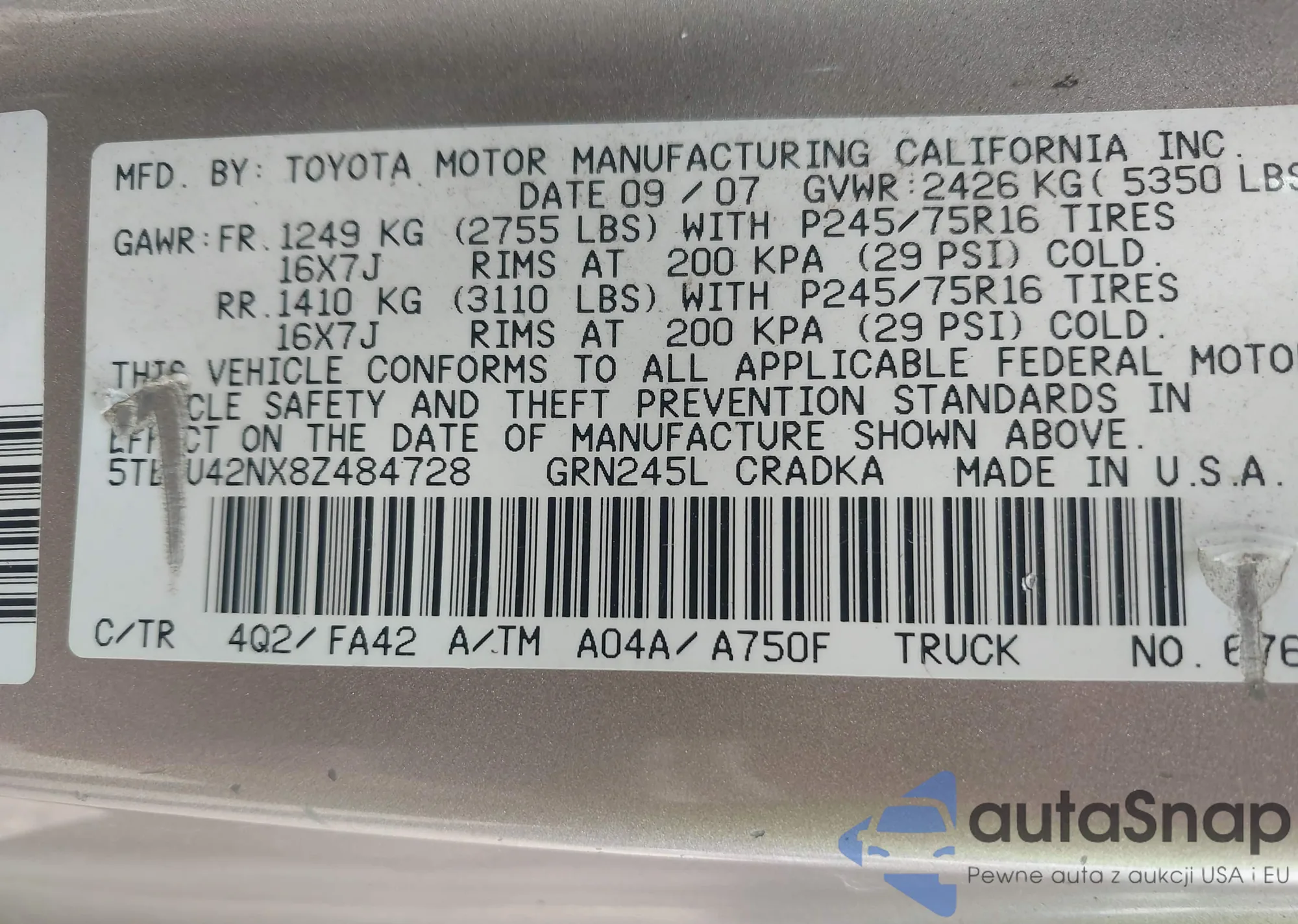 • VIN 5TEUU42NX8Z484728