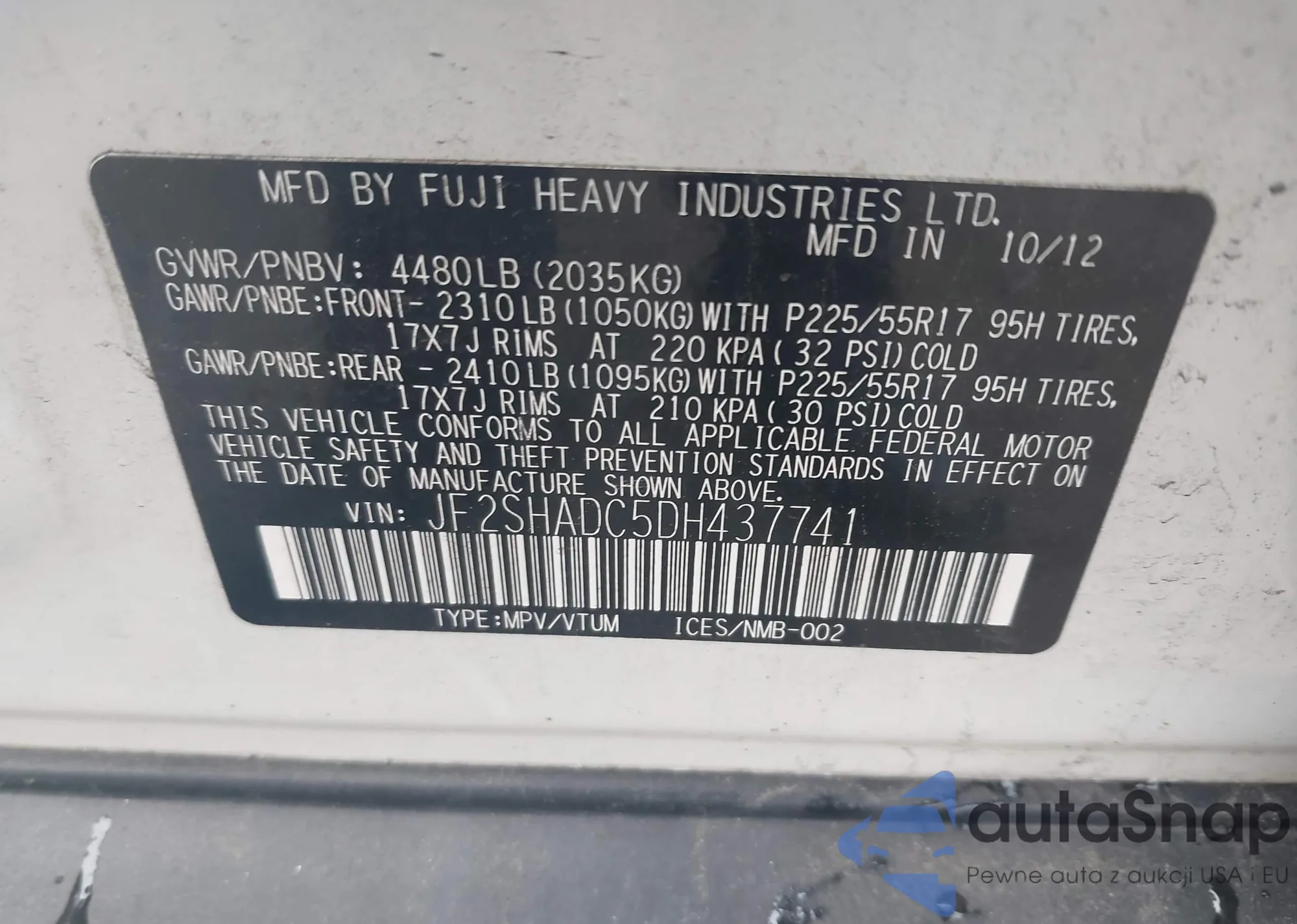 LOT: 43046064 VIN: JF2SHADC5DH437741