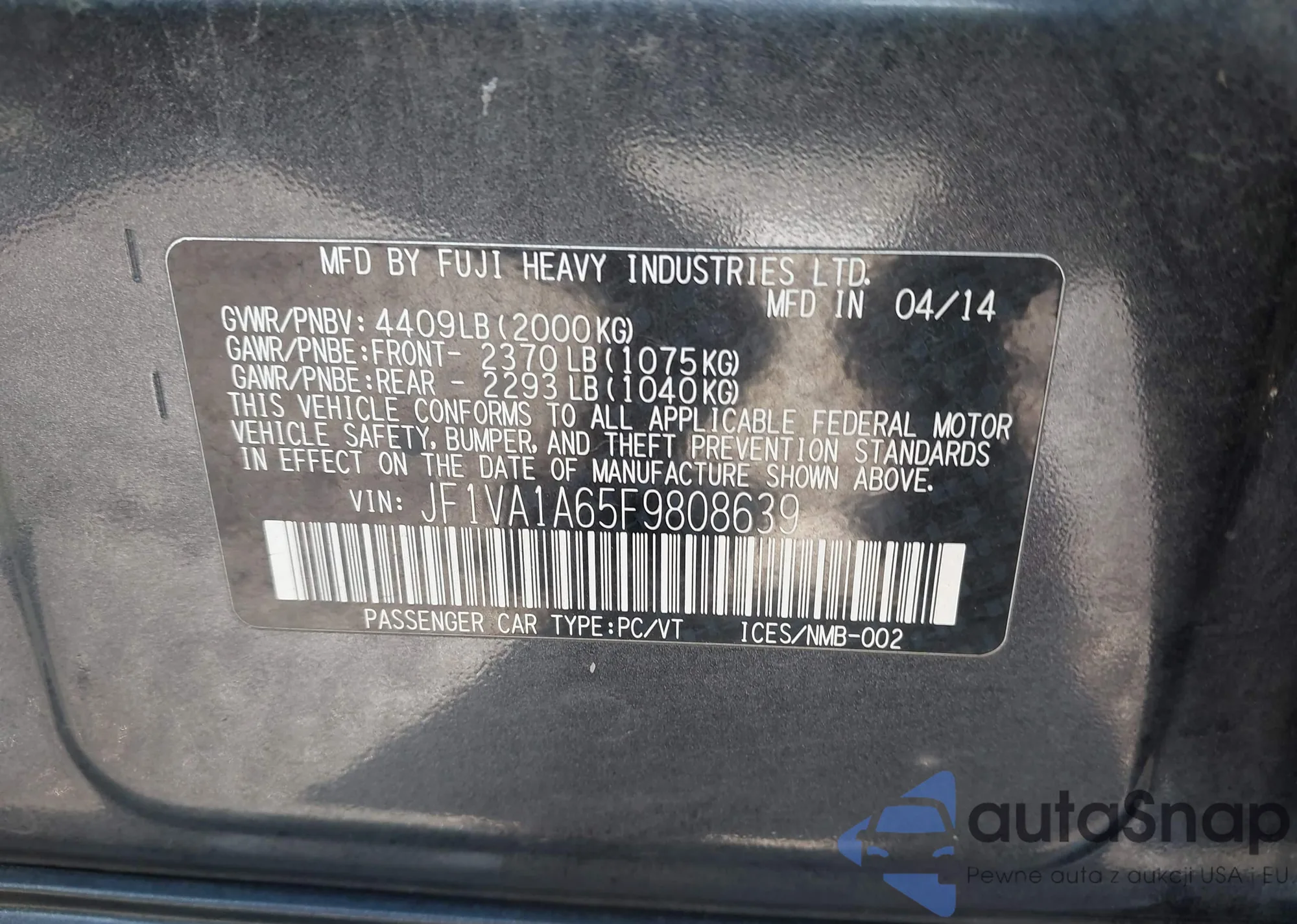 LOT: 42792621 VIN: JF1VA1A65F9808639