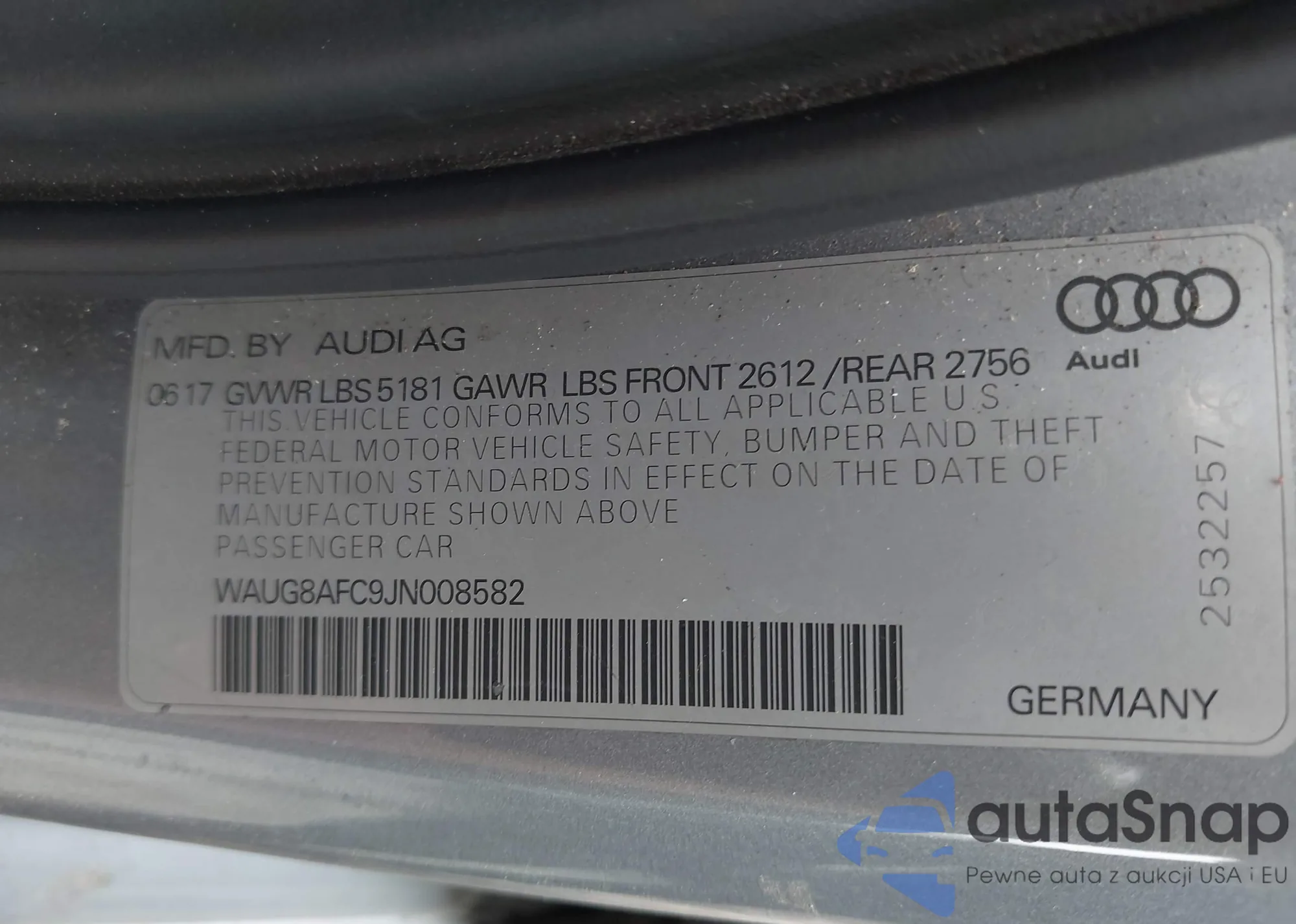 LOT: 42801443 VIN: WAUG8AFC9JN008582
