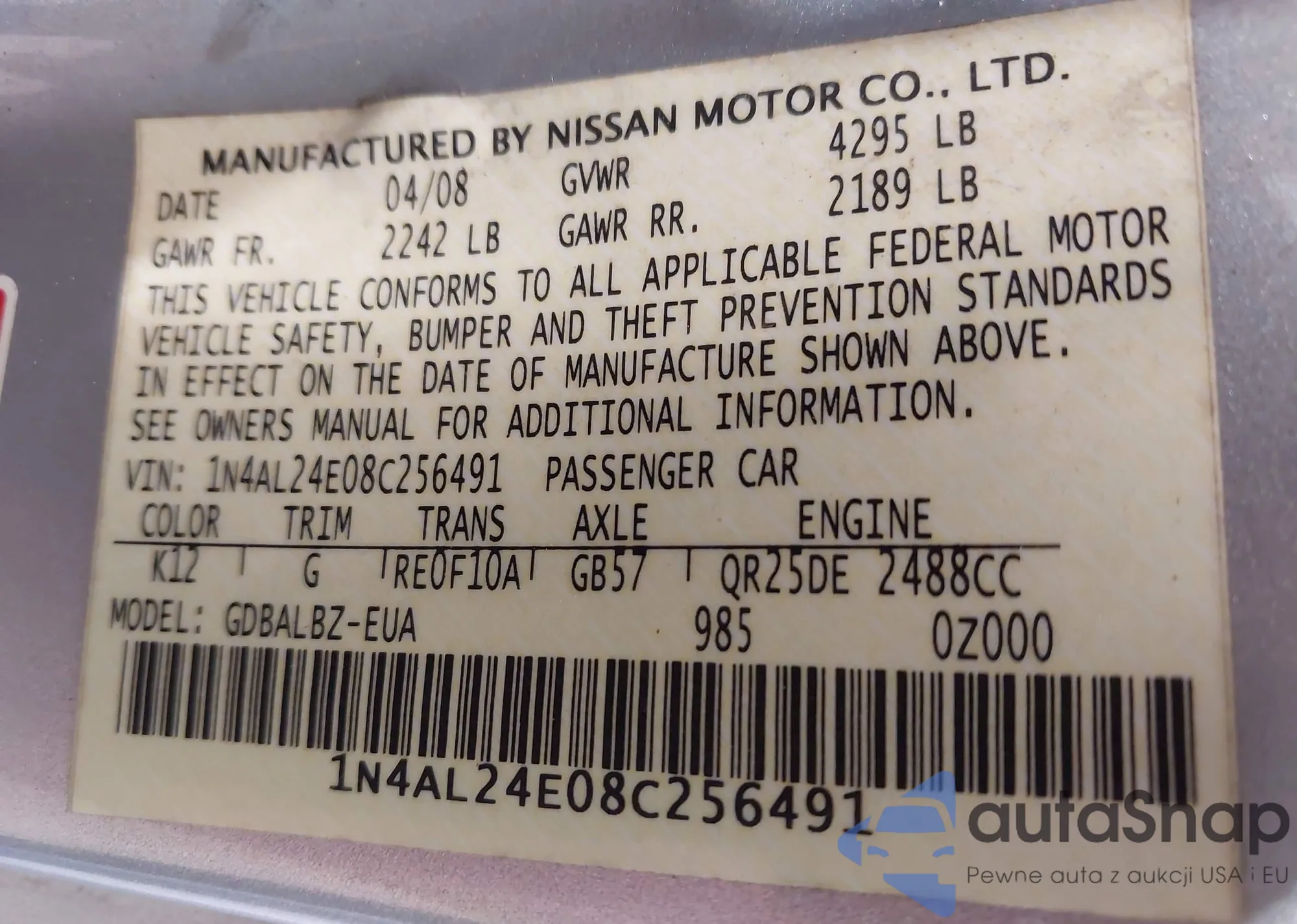 LOT: 42542582 VIN: JHMCP26378C070805